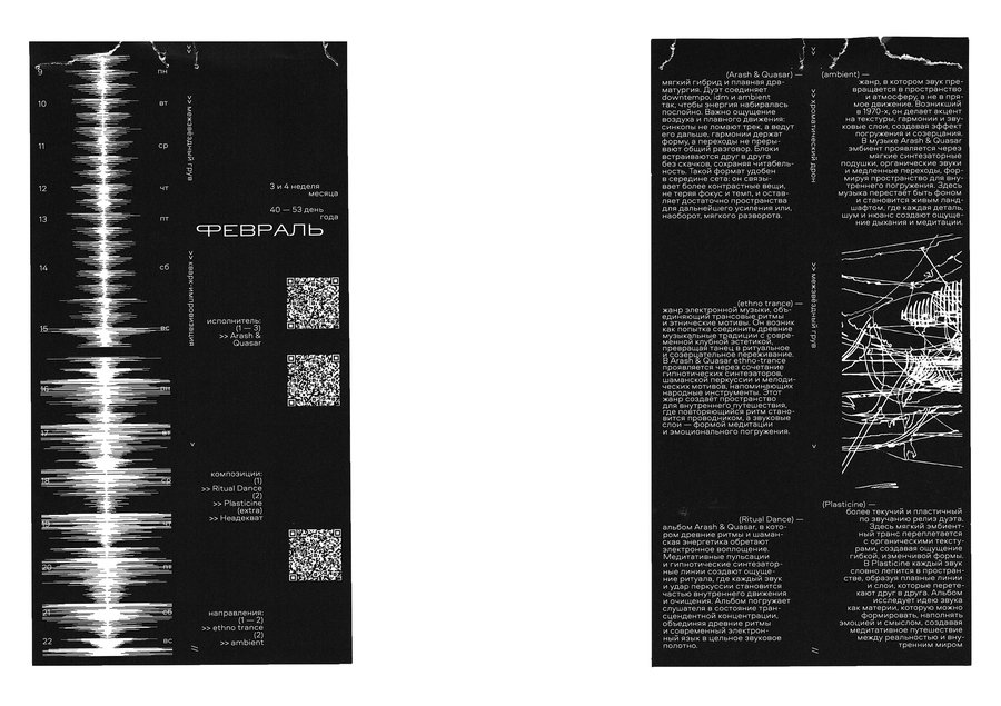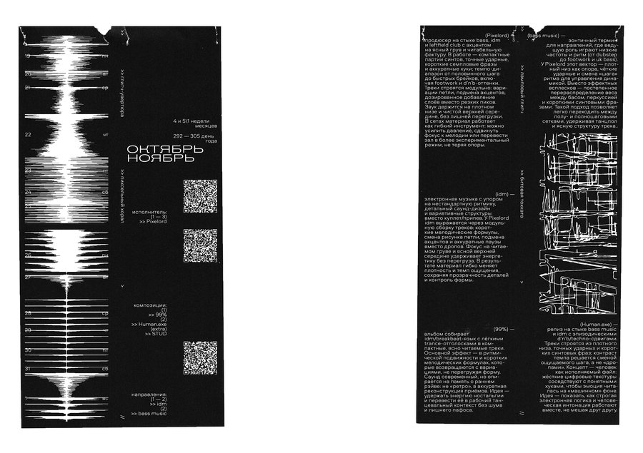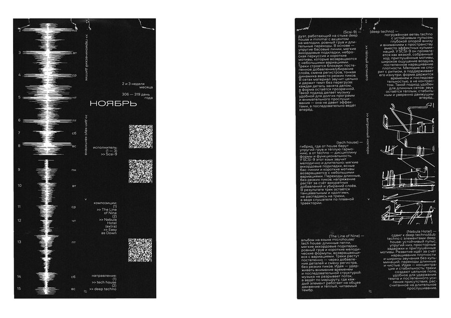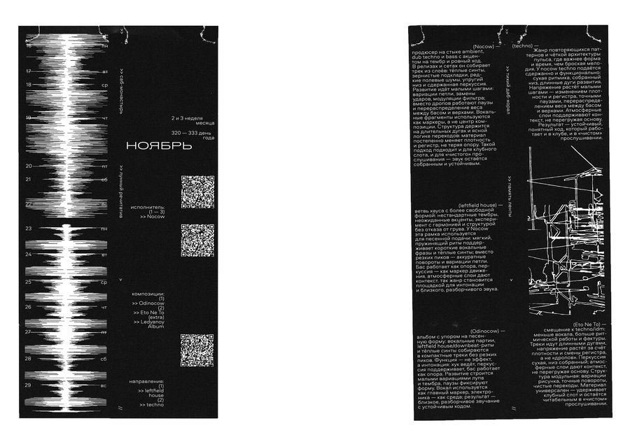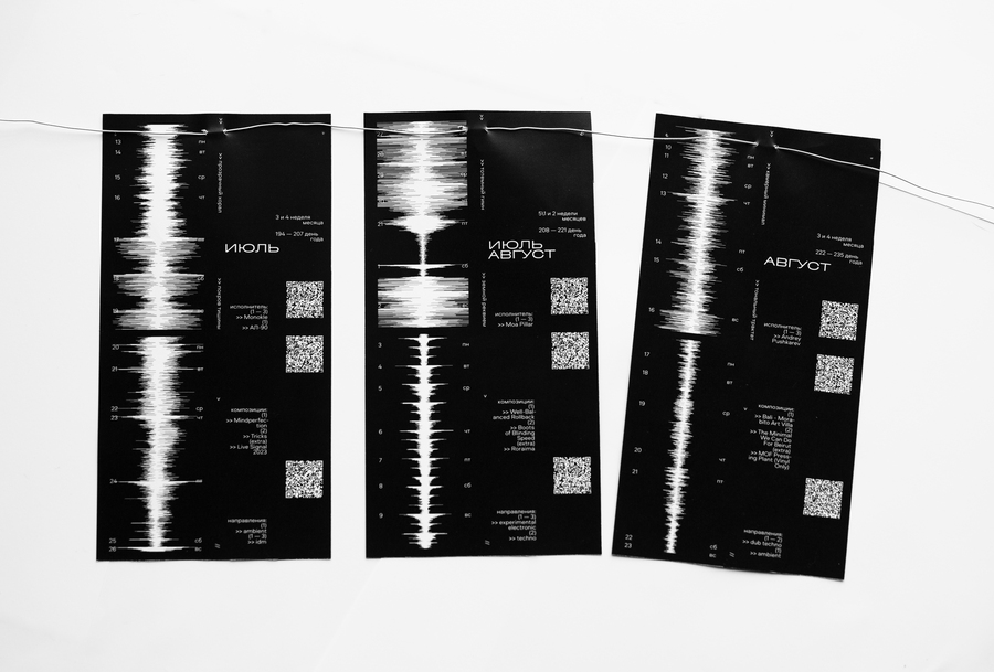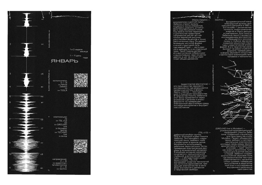 в календаре я использовал иллюстрации, сгенерированные с помощью ИИ. я отправлял отрывок или полную композицию музыканта в ChatGPT — он анализировал её и выдавал промпт для ComfyUI, где я генерировал изображения, а затем анимировал их. при создании видео я также использовал отрывок композиции, чтобы задать ритм смены кадров. после этого с помощью TouchDesigner превращал материал в «видео из линий» и оттуда выбирал наиболее характерный кадр для календаря.