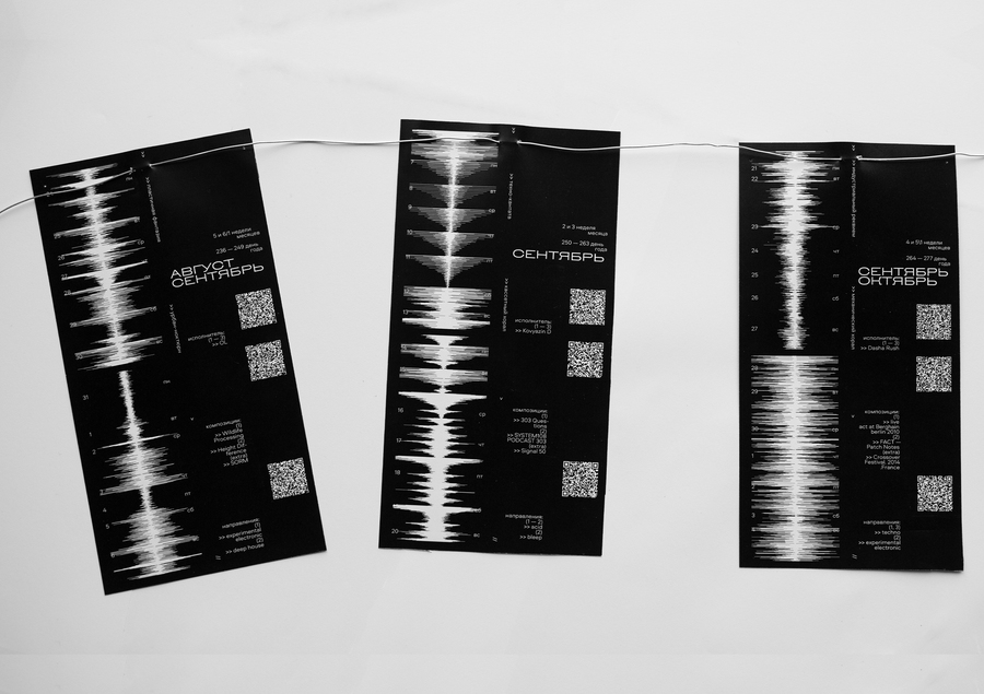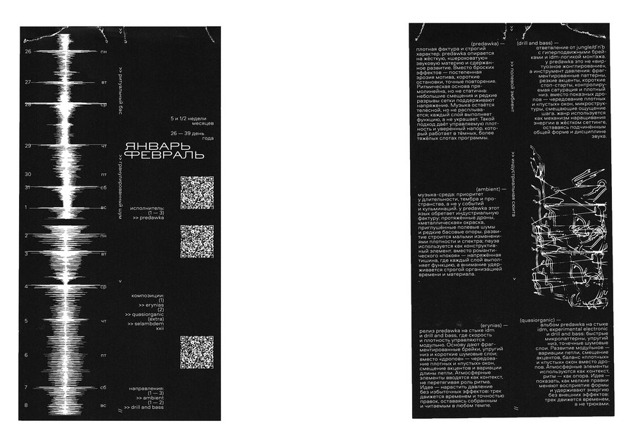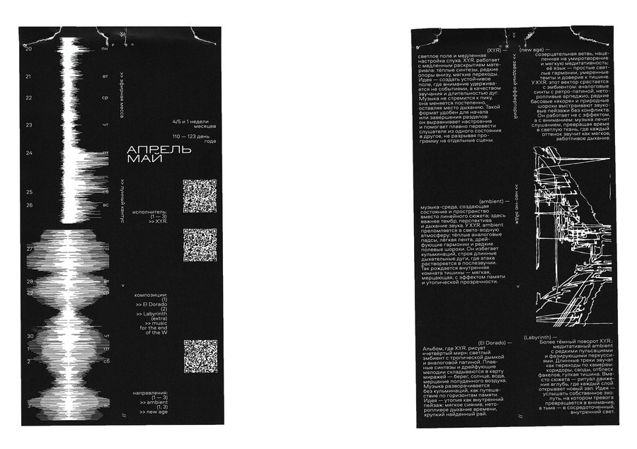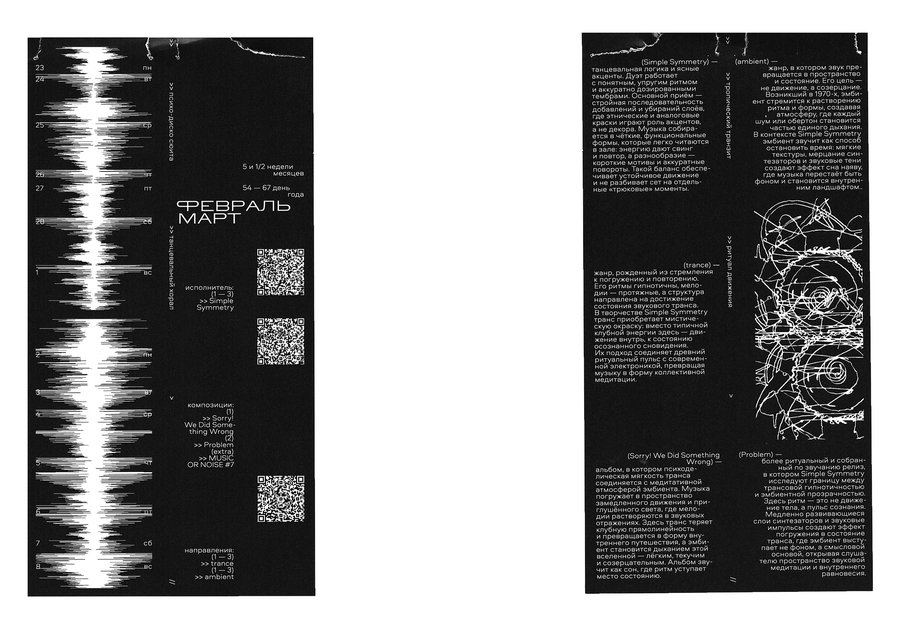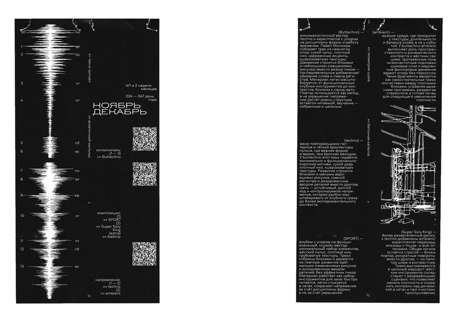 в календаре я использовал иллюстрации, сгенерированные с помощью ИИ. я отправлял отрывок или полную композицию музыканта в ChatGPT — он анализировал её и выдавал промпт для ComfyUI, где я генерировал изображения, а затем анимировал их. при создании видео я также использовал отрывок композиции, чтобы задать ритм смены кадров. после этого с помощью TouchDesigner превращал материал в «видео из линий» и оттуда выбирал наиболее характерный кадр для календаря.
