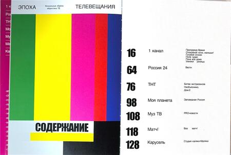 Всего в книге 7 блоков, каждый новый блок начинается с нового жанра телепрограммы и канала и имеет свой цвет