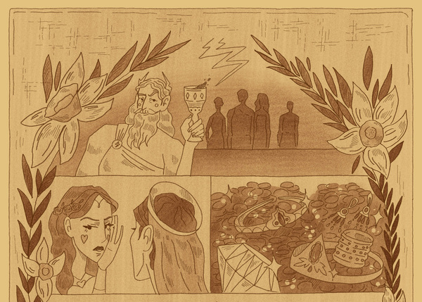 Миф повествует о самоуверенной и наглой мастерице Арахне, которая возгордилась своим искусством ткачества и вызвала Афину-Палладу на состязание в этом мастерстве.