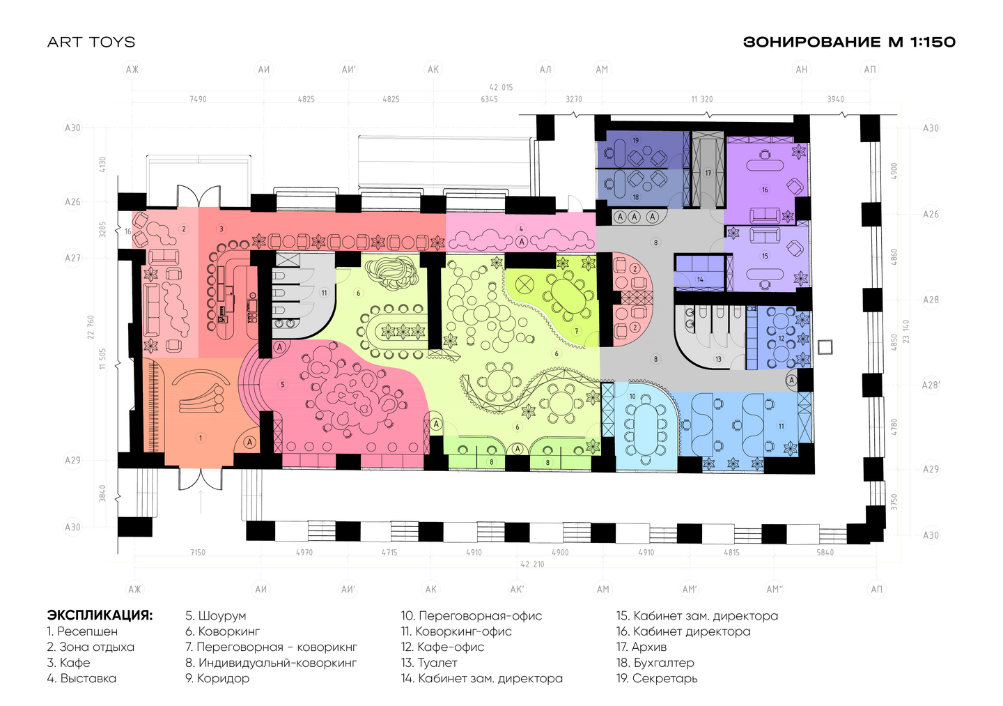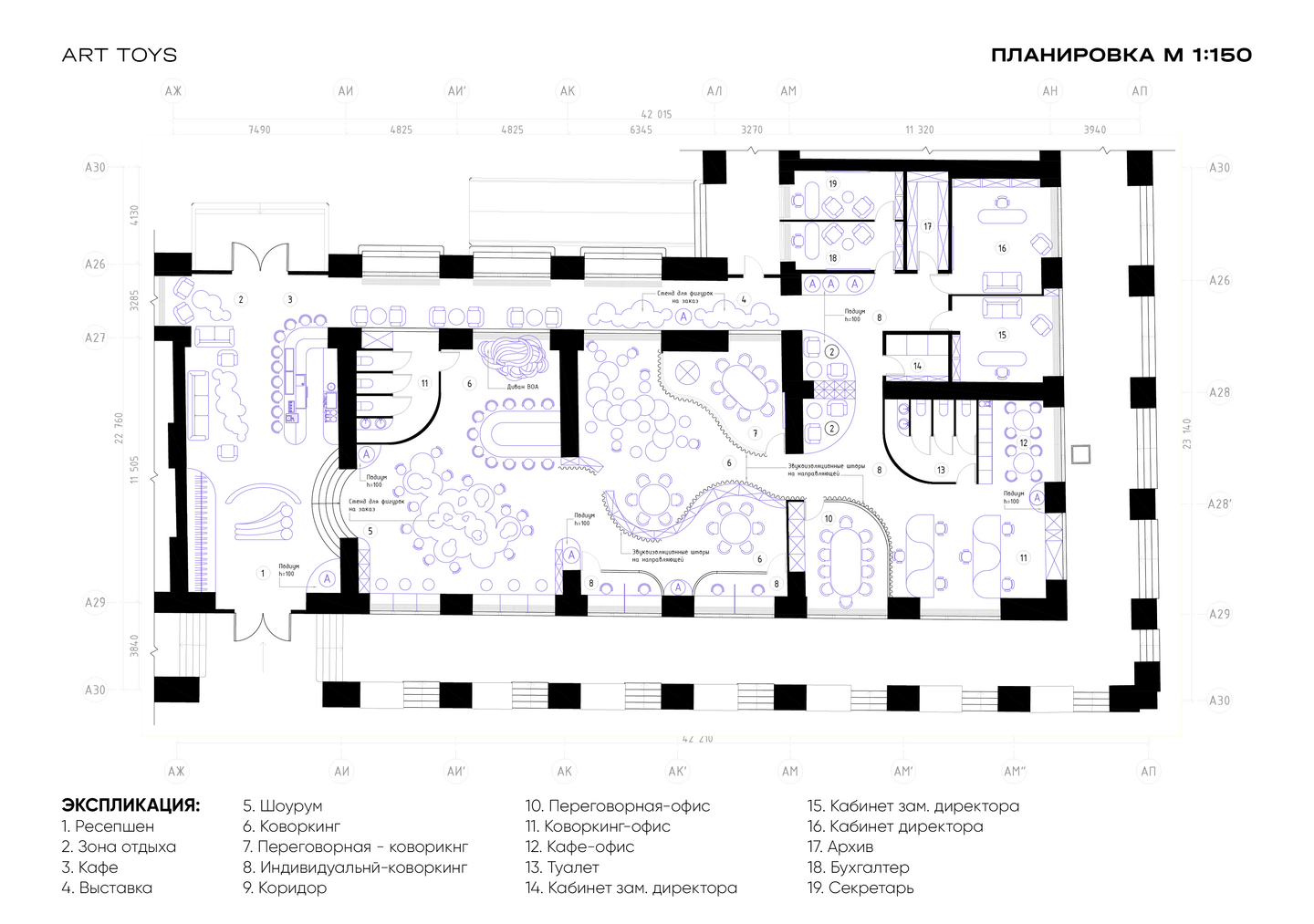 Концепция молодежного пространства «ART TOYS» объединяет шоурум коллекционных игрушек и офисные зоны в единой атмосфере творчества и поп-культуры.