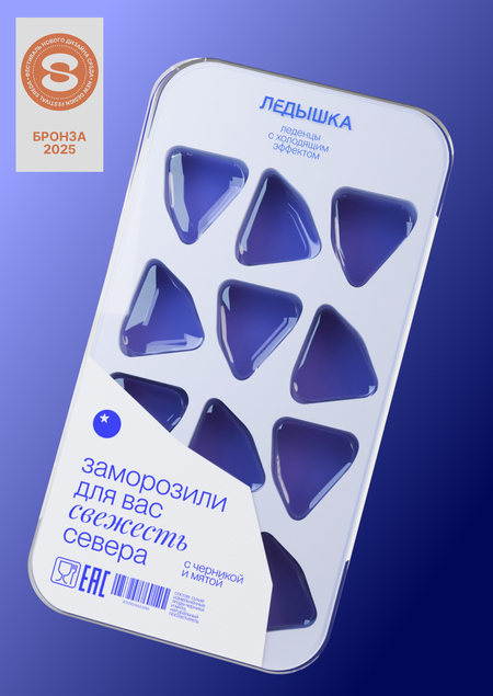 Дизайн упаковки холодящих леденцов был разработан с учетом формы, которая напоминает емкость для заморозки льда, подчеркивая их освежающую концепцию и связь с северным холодом