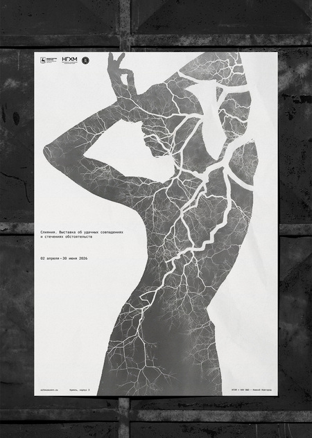 Визуальное решение плаката строится на принципе слияния нескольких образов: человеческого силуэта, природной структуры и картографии. Графика внутри фигур одновременно считывается как лесная крона, речная сеть и метафорическая карта взаимосвязей — эти системы накладываются друг на друга, образуя пространство пересечений, в котором природное и рациональное соединяются воедино, отражая идею выставки, места слияния смыслов и образов.