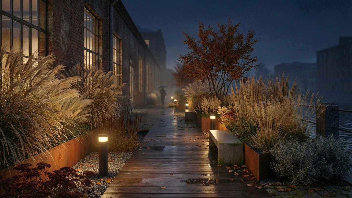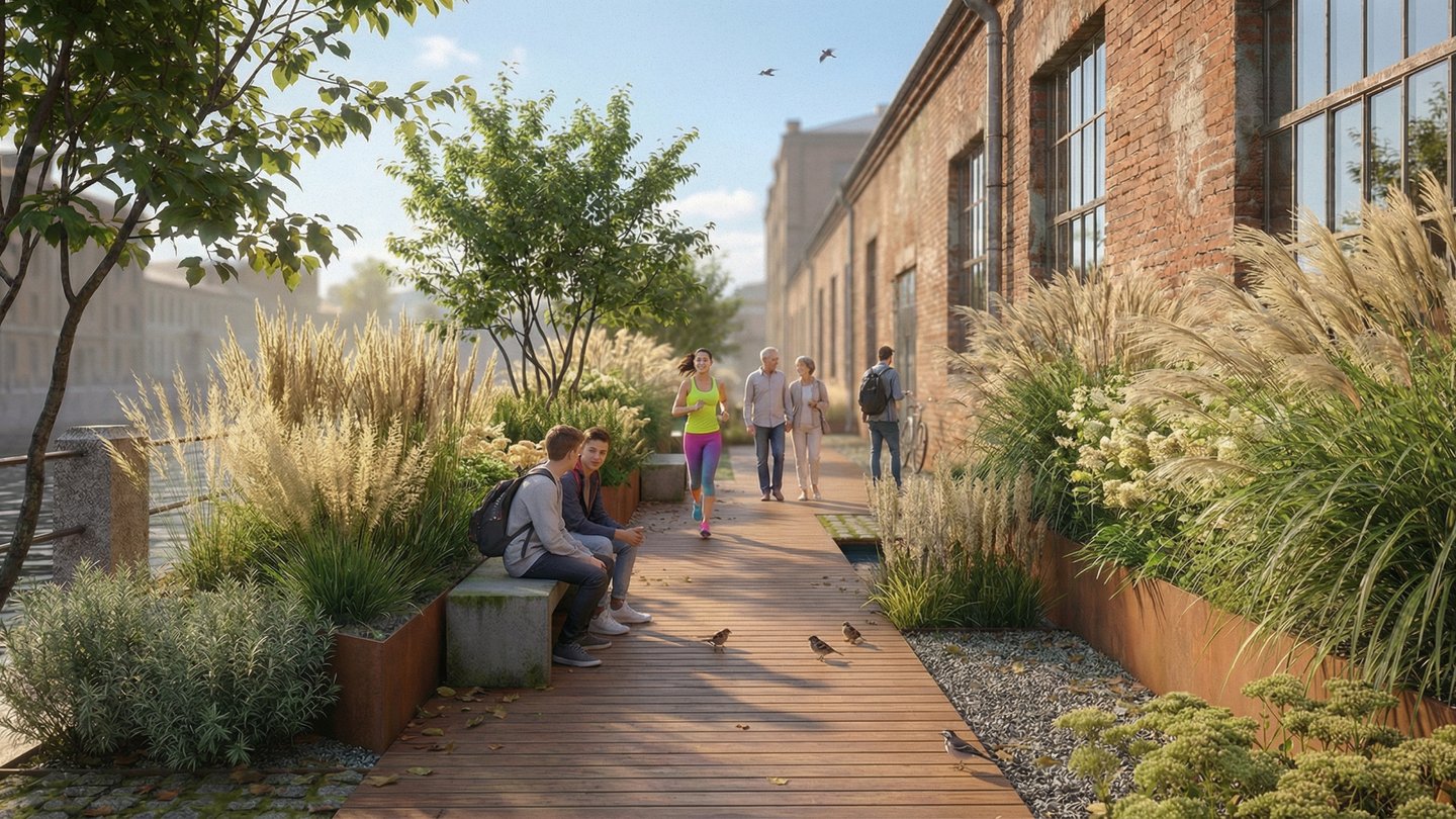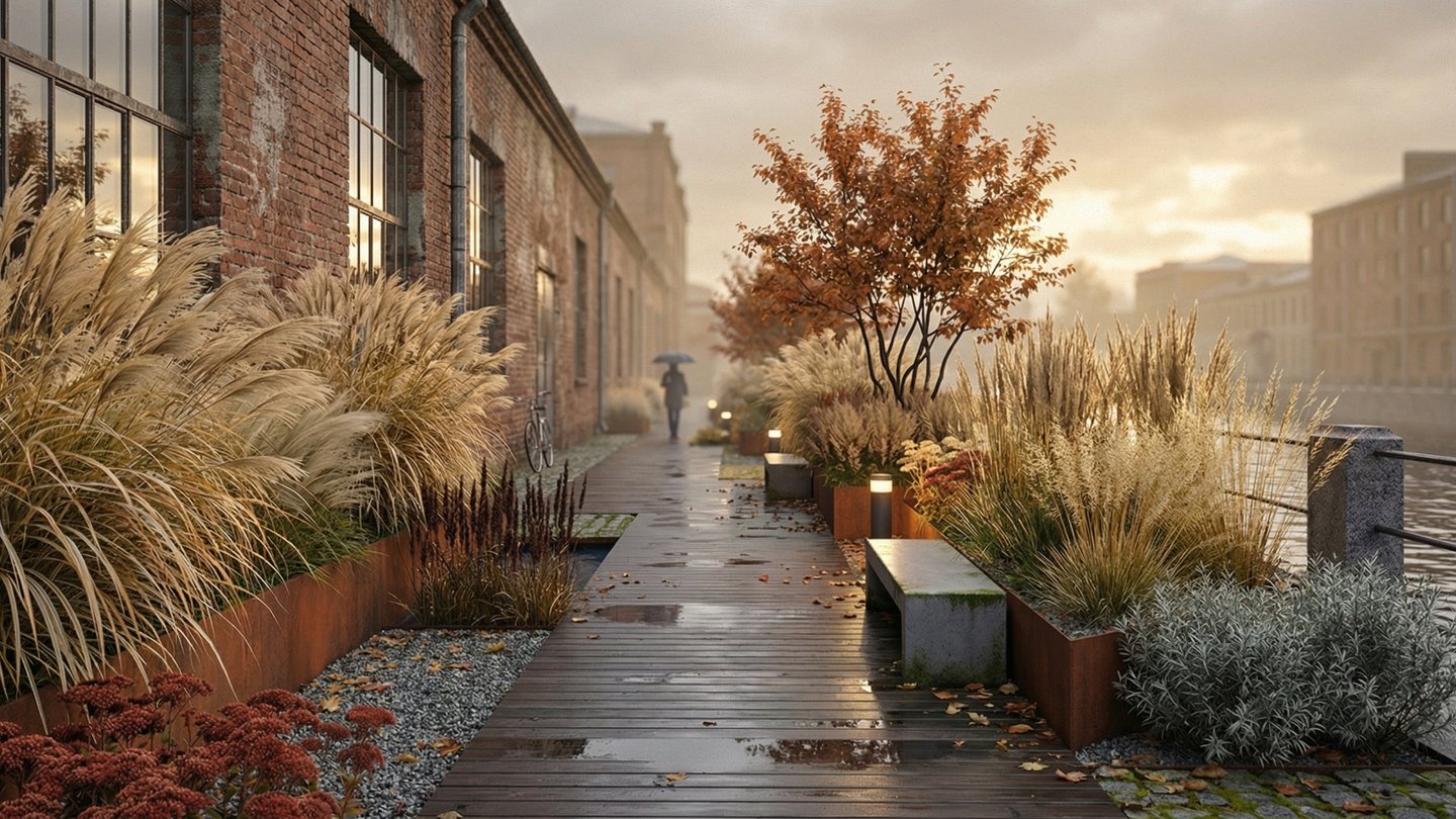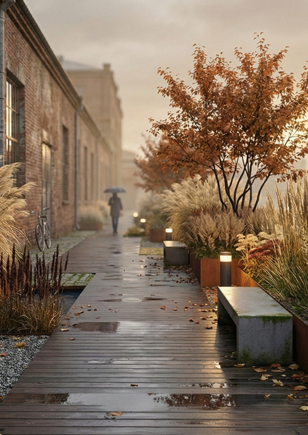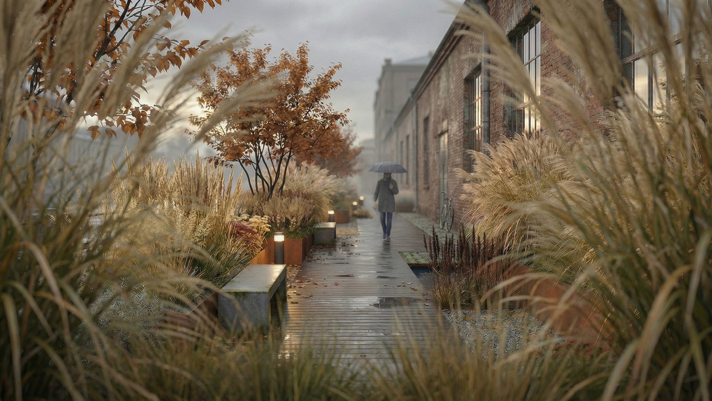 Сад между кирпичными корпусами и Обводным каналом соединяет индустриальное прошлое Петербурга с природной стихией — растения впитывают дождь, меняются с сезонами и создают пространство для остановки там, где раньше была только граница.