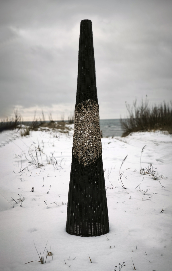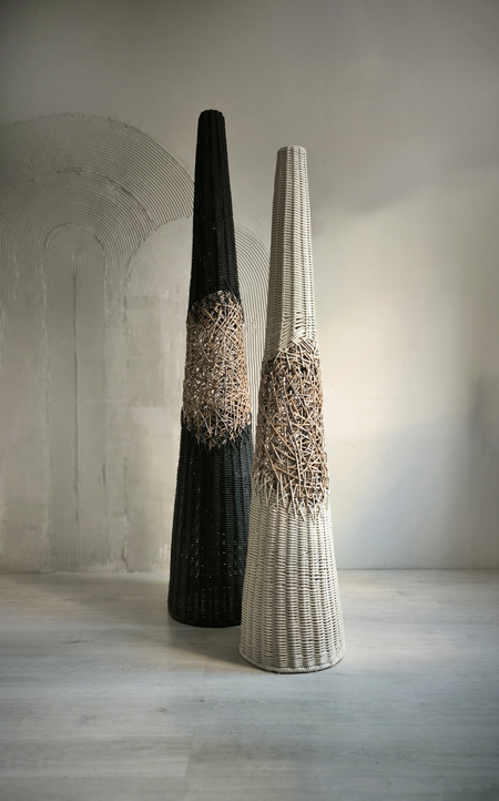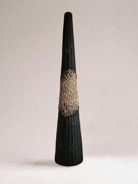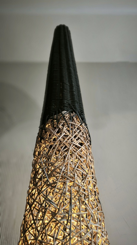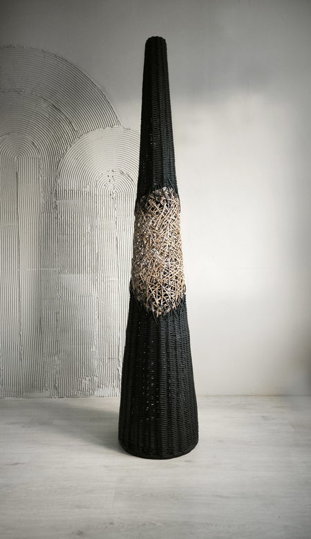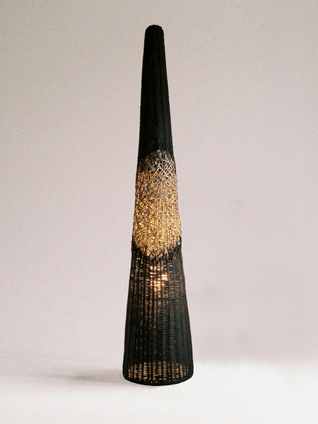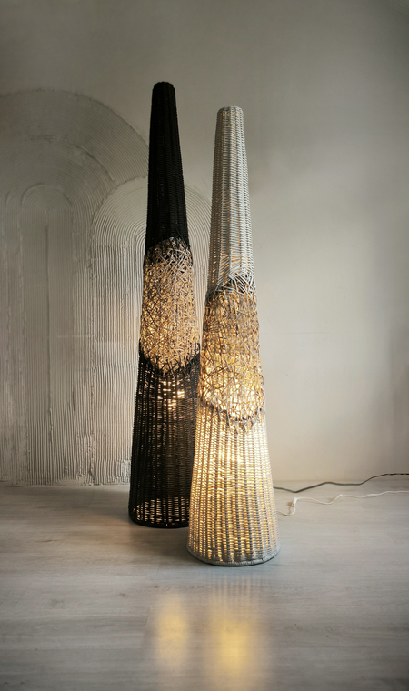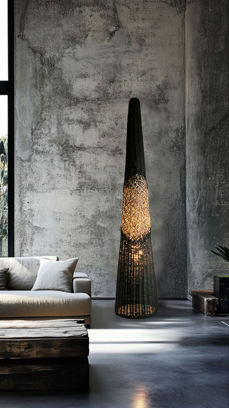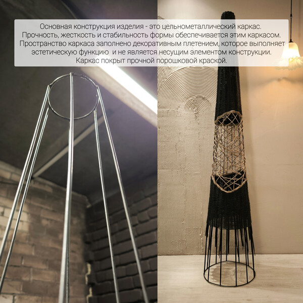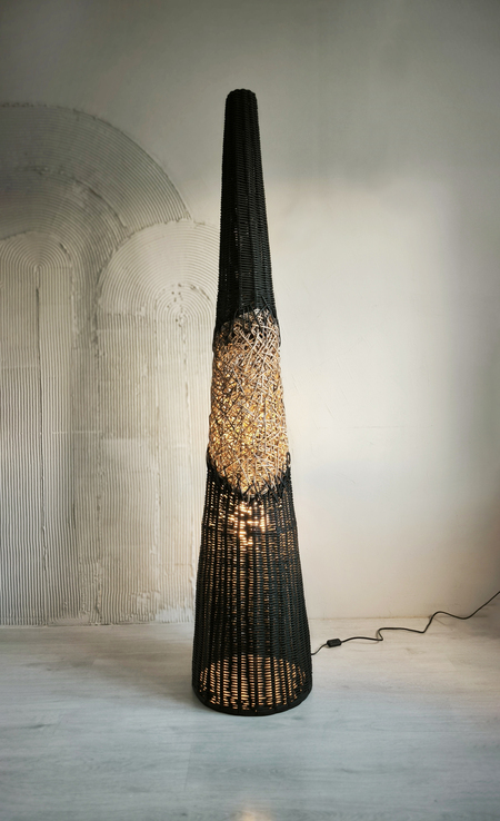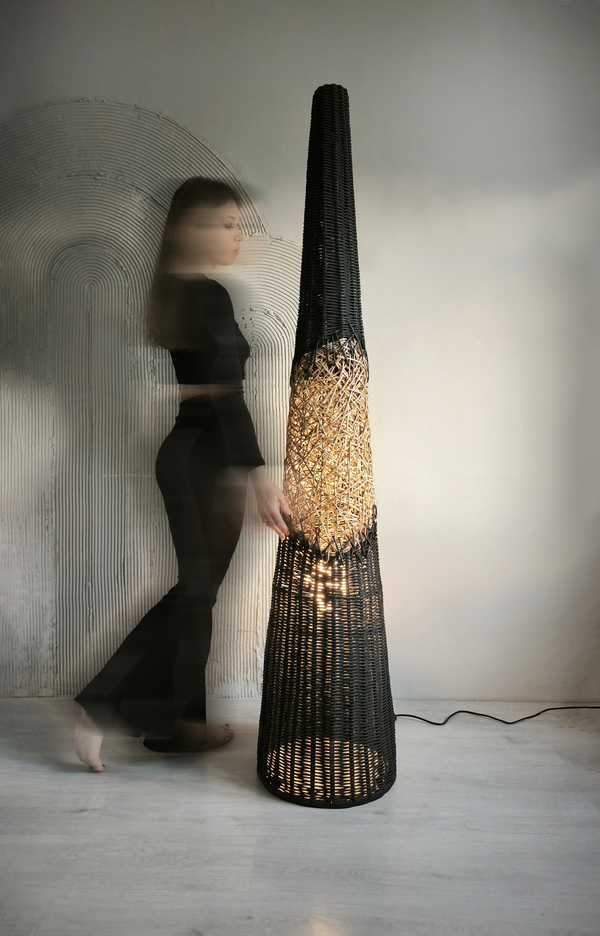 Торшер «Черный лес» это дизайнерский диалог между строгим расчетом и творческим импульсом. Идеальный конус, выдержанный в абсолютном черном цвете, служит чистым холстом для главного высказывания — вихря ручного плетения в его центре. Беспорядочное, интуитивное переплетение, будто возникшее спонтанно, ломает геометрическую безупречность формы. Это воплощенный контраст, который оживляет пространство.