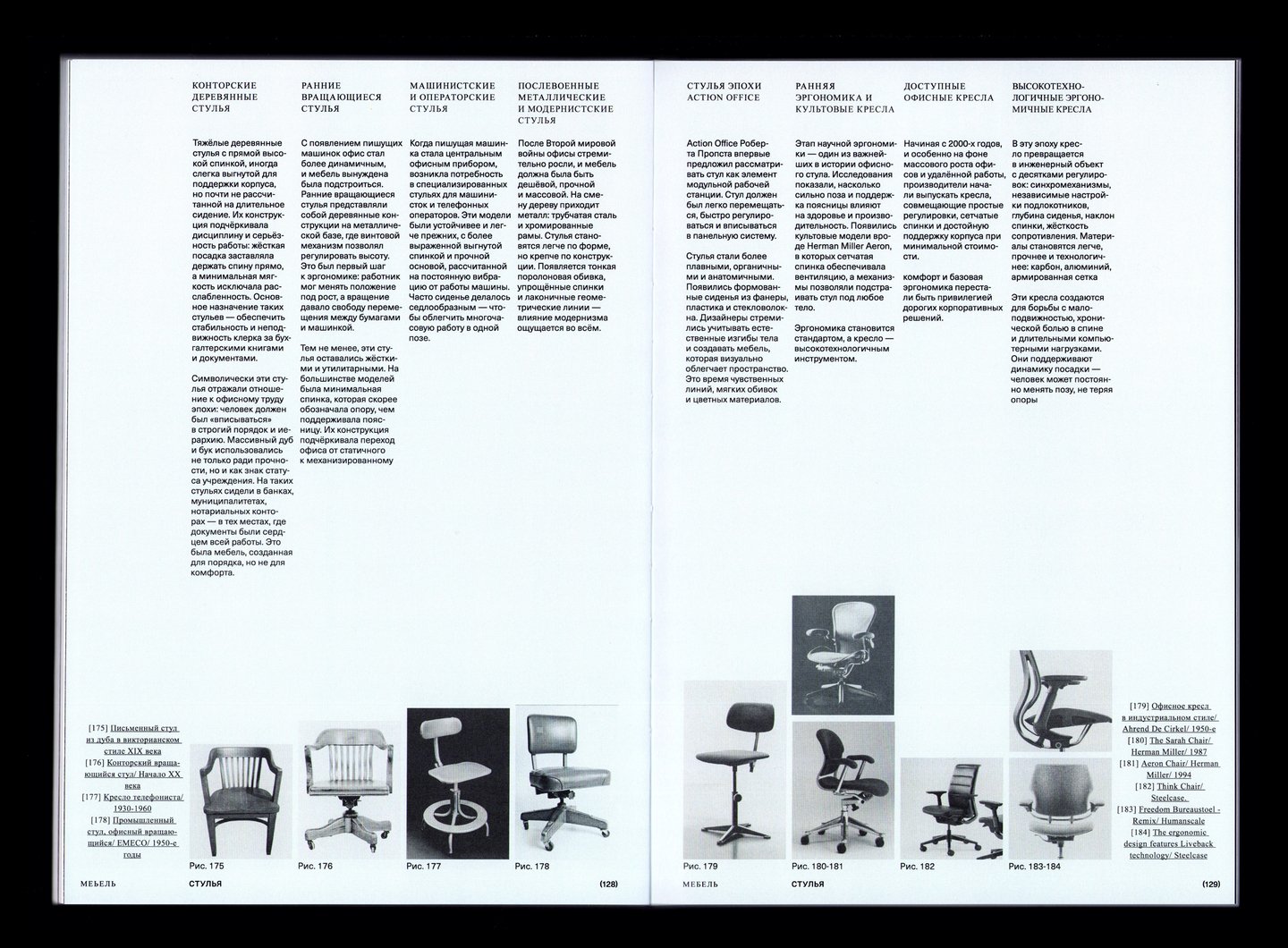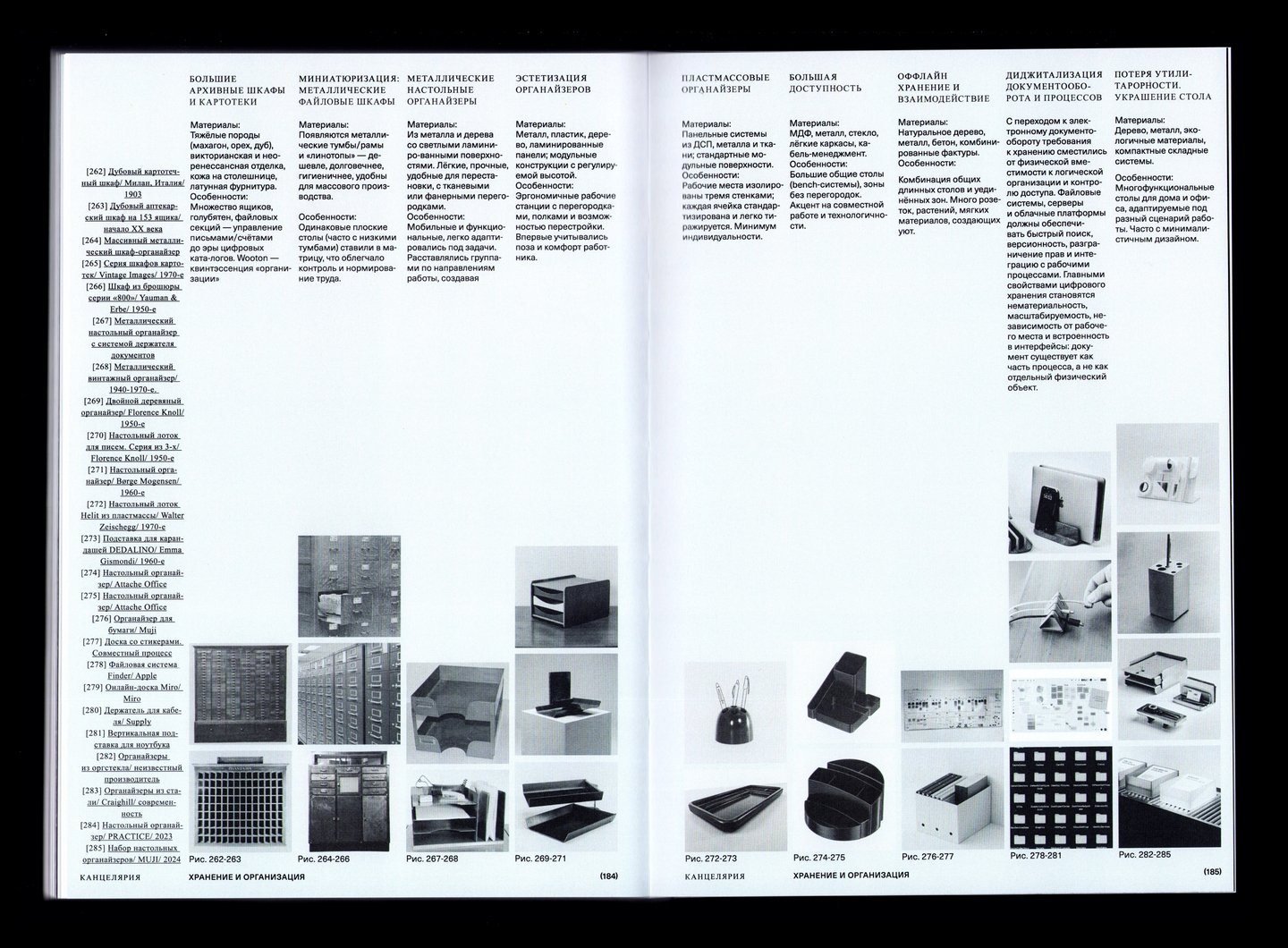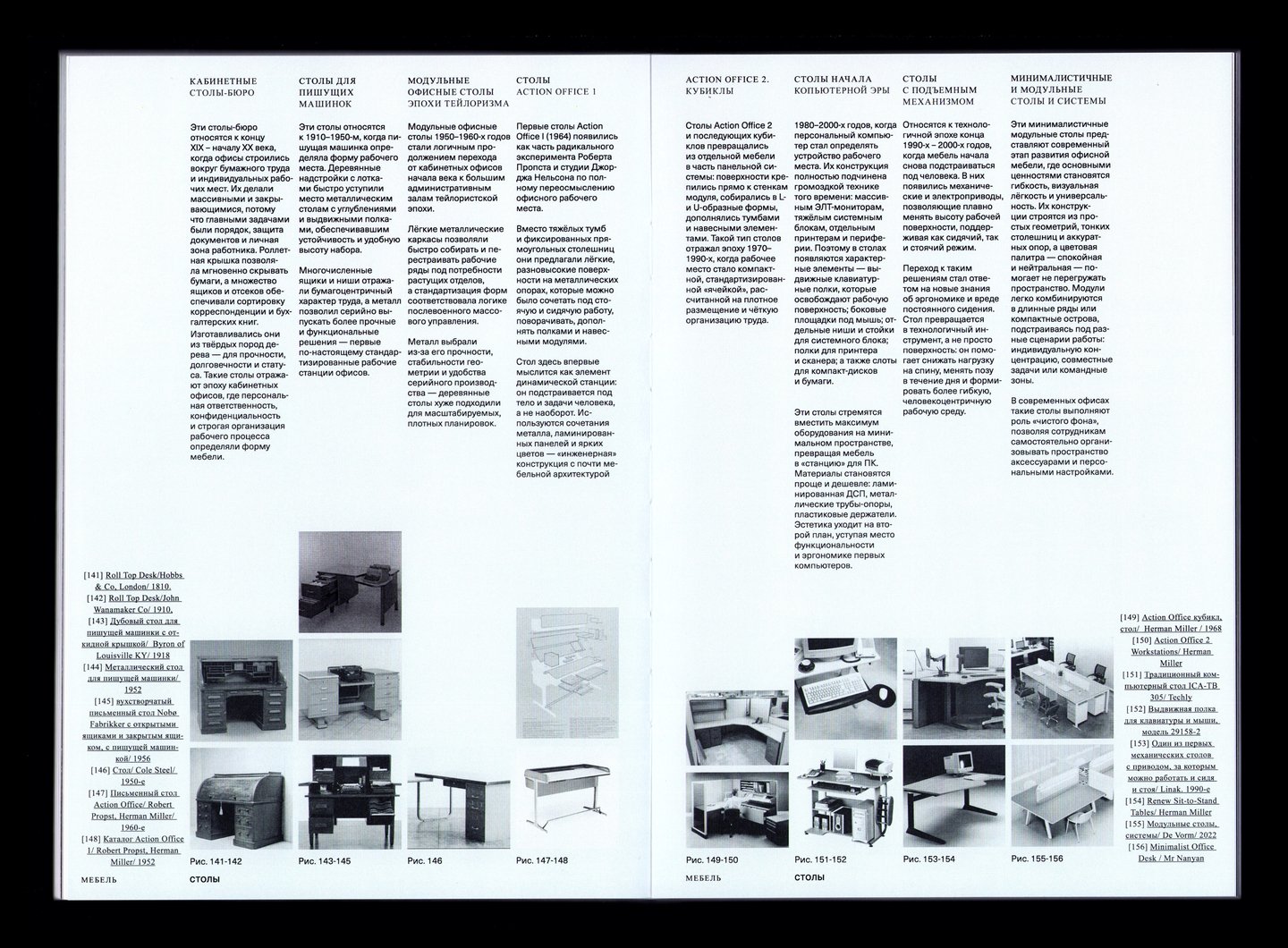 Основной контент строится на аналитическом тексте, цитатах дизайнеров и архитекторов и визуальных материалах — фотографиях, чертежах, сканах документов и каталогов. Первый раздел и каждая подглава завершаются сводной таблицей, наглядно фиксирующей ключевые образы и переходы от эпохи к эпохе.