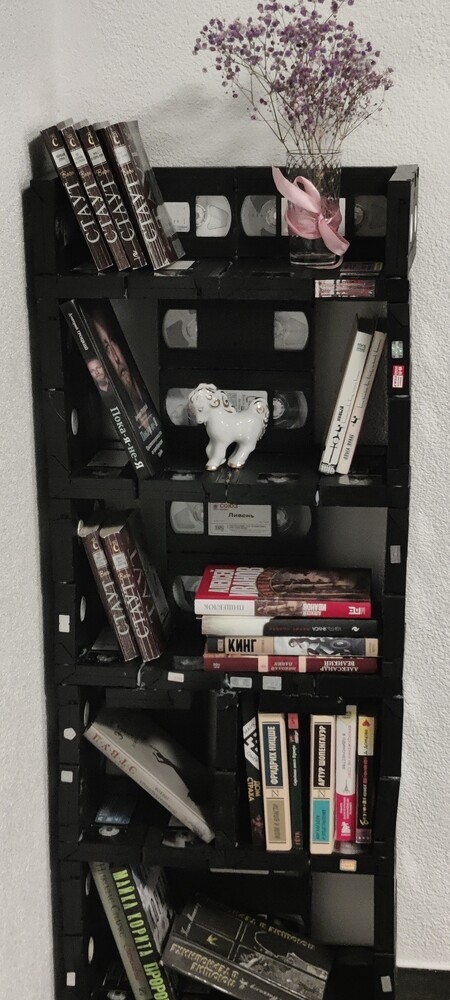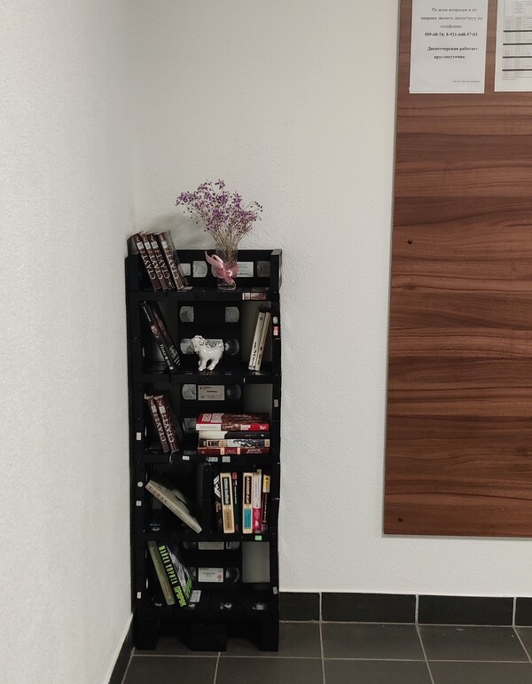 Shelves for book-crossing made of videotapes. By Victoria A. Chuikina. Concept: Upcycle! Make treasure out of trash. Shelves are made to allow residents of an appartment complex share used books via book-crossing. The shelves can be used by neighbours or anyone who has access to the ground floor. The shelves are made of videotapes glued together with a hot glue gun. Weight around 15 kg. Size: 1165×426×376 mm. Year shelves were made in: 2024. Made in the number of 1 ps. Price — free, cost of making — the price of hot glue.