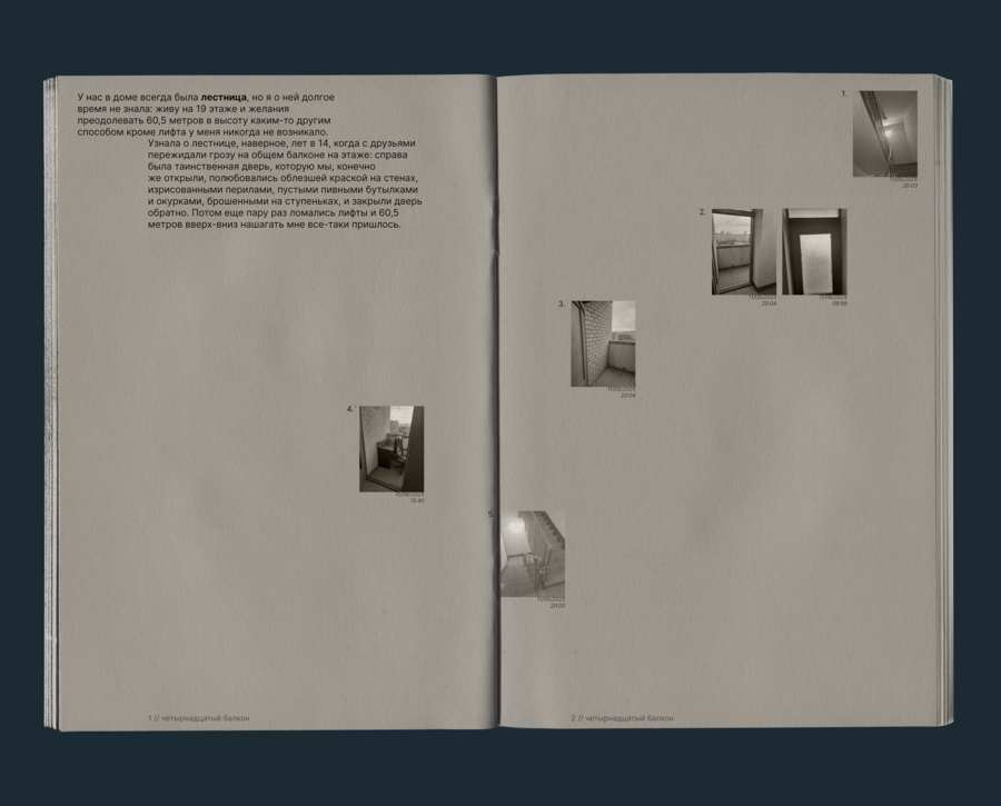В зине я рассказываю о собственном взаимодействии с балконом: когда и при каких обстоятельствах я узнала о его существовании, что чувствовала, возвращаясь туда из раза в раз, какие детали успела подметить до того, как там убрались. Помимо серии иллюстраций, я также задействовала фотографии, сделанные мною в разные даты.