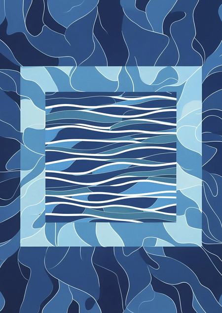 Прикрепить карточку Промт: Bright pattern, blue tones, with a square around the edge and a water pattern inside, illustration Инструменты: нейросеть ideogram, апскейлер betterimage