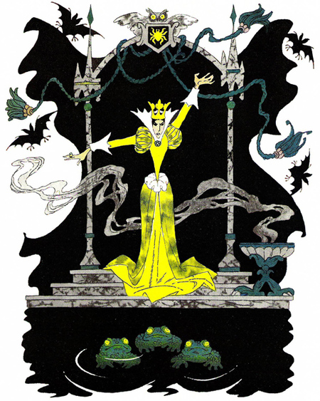 Работая с цветом, Булатов и Васильев вновь создают ограниченную палитру, в которой яркими акцентами служат розовый и голубой оттенки, но находится место и для сложных, землисто-зеленых оттенков, используемых для изображения природы. Для образе злой королевы художники подбирают желтый цвет, который в той же «Золушке» воспринимался солнечным и светящимся, но в темном, приглушенном окружении воспринимается ядовитым, отталкивающим и неестественным.