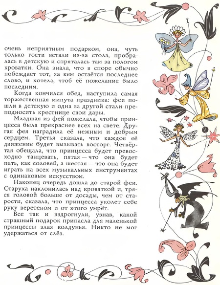 Пространство книги для Булатова и Васильева вновь не ограничивается только большими иллюстрациями. Поля вокруг текстовых блоков также заполняются декоративными растительными орнаментами, среди которых разворачивается действие. Так, например, на одном разворотов мы видим волшебных фей, прибывающих на праздник, которые выглядят как разнообразные чудесные цветы. В образе Злой ведьмы же прослеживается сходство с летучей мышью и даже некий оммаж с сторону горгулий.