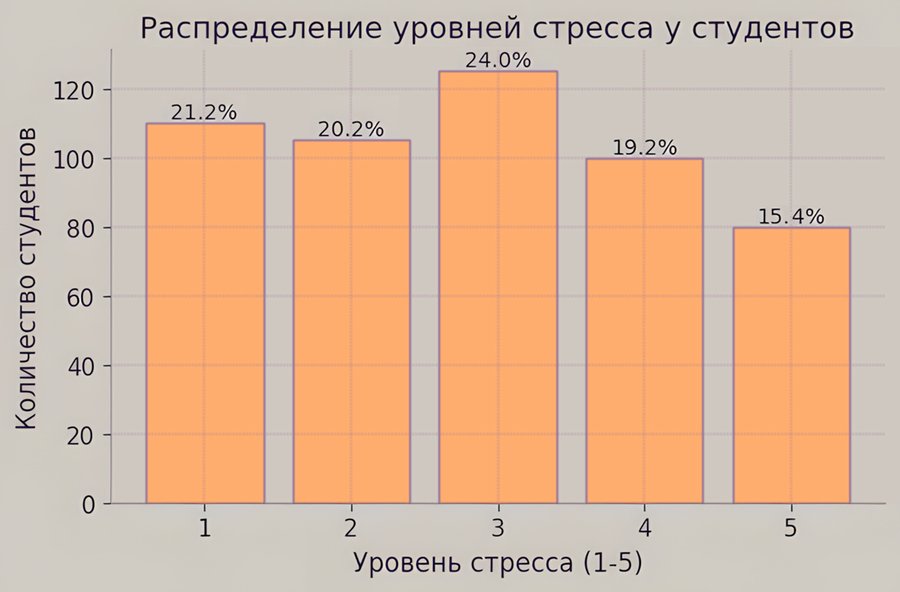 Столбчатая диаграмма показывает количество студентов на каждом уровне стресса. Уровень стресса распределен достаточно равномерно, при этом оценка 3 встречается чаще всего, у 24% студентов. Показательно, что доля оценок 5 (наивысший уровень стресса) более чем на 5% меньше, чем доля оценок 1, что указывает на сравнительно небольшое количество студентов с экстремально высоким уровнем стресса.