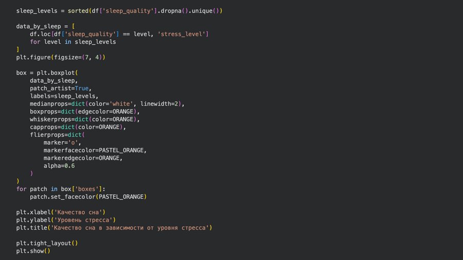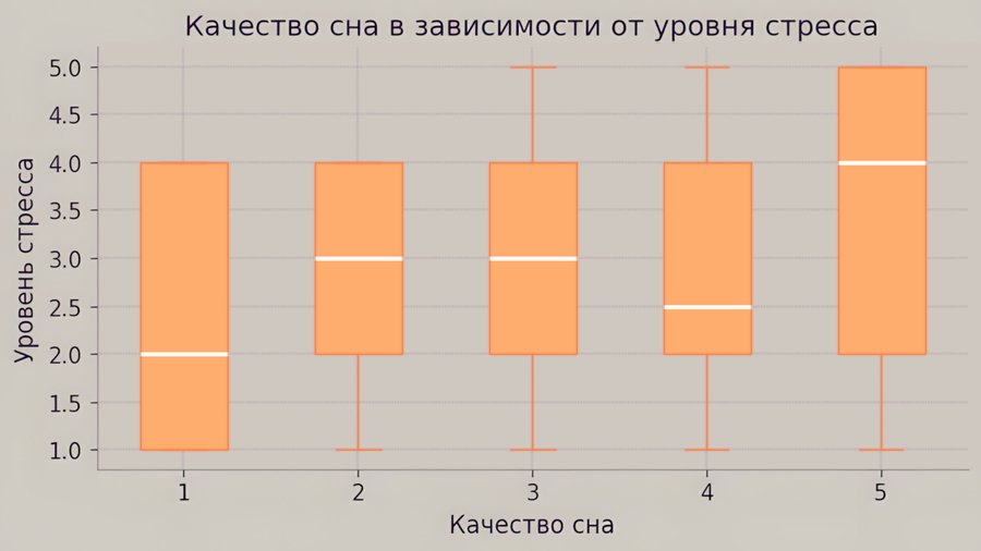 На графике представлена зависимость между качеством сна и уровнем стресса. Но полученный результат оказался неожиданным. Логично было бы предположить негативную зависимость между качеством сна (где 1 — худший вариант) и уровнем стресса (где 5 — худший вариант): чем выше стресс, тем хуже сон. Однако данные демонстрируют обратную картину. Это подчеркивает ограничения небольших наборов данных, основанных на самоотчетах, и подтверждает важность предварительного исследовательского анализа перед формированием объяснительных выводов.