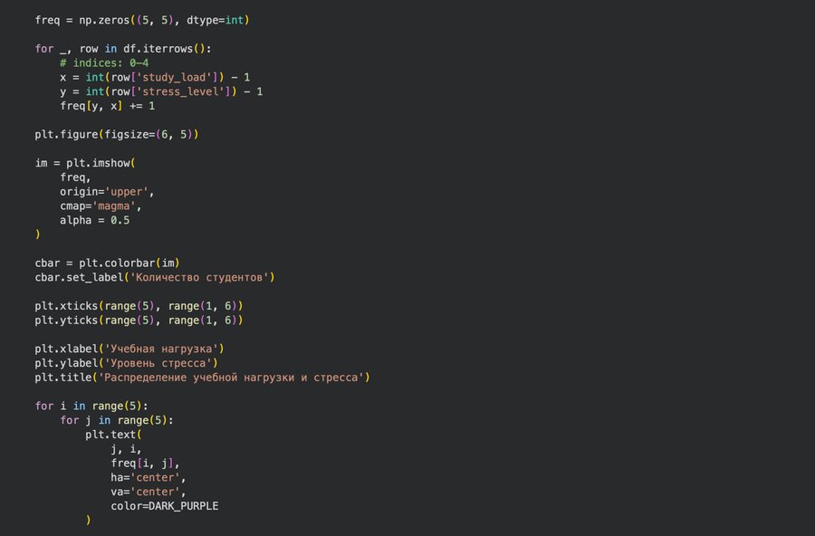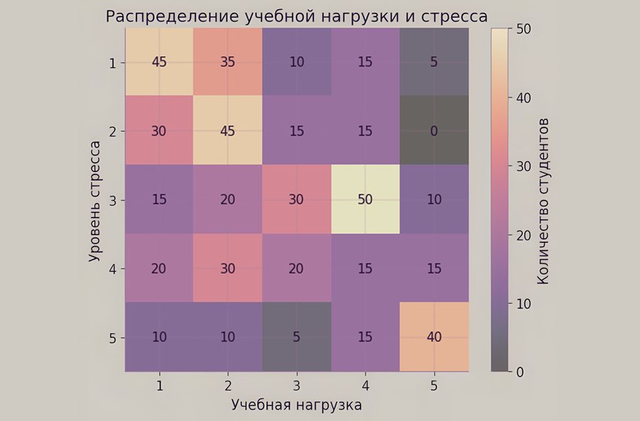 Тепловая карта демонстрирует соотношение между уровнем учебной нагрузки и уровнем стресса. В целом наблюдается тенденция роста стресса при увеличении нагрузки.