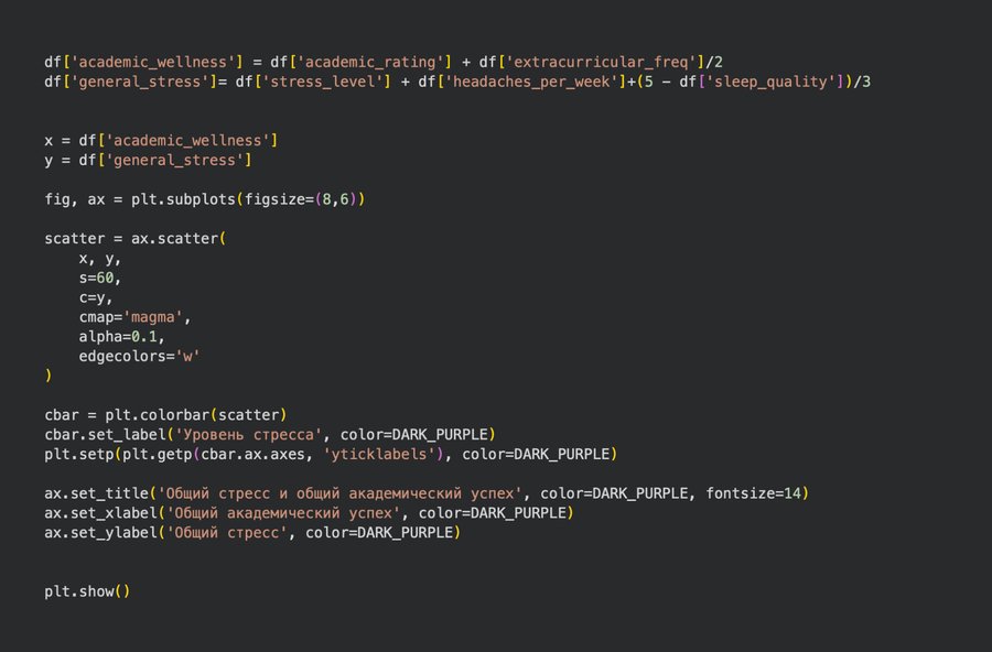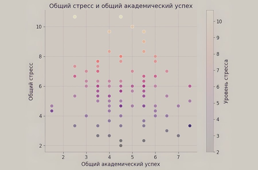 Для финального графика были рассчитаны усредненные показатели: академического успеха ((успеваемость + внеучебные активности)/2) и общего стресса ((стресс + частота головных болей + (5 − качество сна))/3).