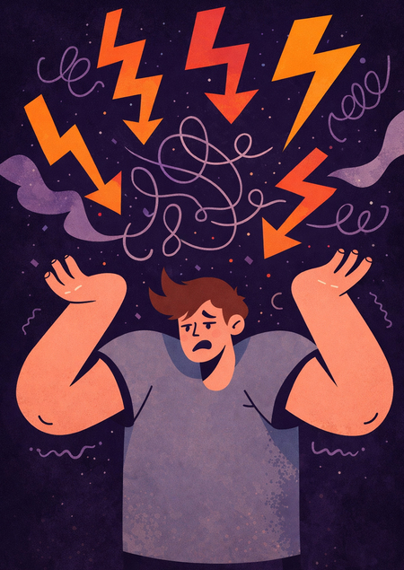Для создания обложки проекта я использовала функцию создания изображений в Chat GPT. Промпт A stressed student shown from the waist up, shoulders raised and tense, arms lifted as if holding invisible pressure above them. The facial expression shows anxiety and emotional overload. Above and around the student float sharp lightning bolts, zigzag arrows, and tangled abstract lines, symbolizing academic pressure, exams, deadlines, constant notifications, and expectations. The composition visually emphasizes weight and tension pressing down on the student. Flat editorial illustration style with bold simplified shapes and expressive body language. Slightly exaggerated proportions to enhance emotion. Clean, modern, metaphor-driven visual language suitable for educational and mental health topics. Carefully limited color palette: deep dark purple (271033) for background and shadows, muted violet (9E7B9B) for abstract stress forms, warm orange (FA824C) and soft orange (FFAD6E) for lightning bolts and stress accents, soft neutral (CFC8C0) for skin tones and secondary elements. Minimalistic, high-contrast, emotional but not chaotic. No text, no symbols with words. Vertical composition, 2480×3500, flat vector illustration, high resolution, no text, no watermark.
