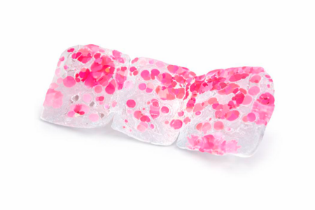 Контейнеры расплавляются под горячим прессом, а измельченные разноцветные крышки вплавляются в основной материал, создавая тонкие прозрачные пластины с уникальными разноцветными подтёками.