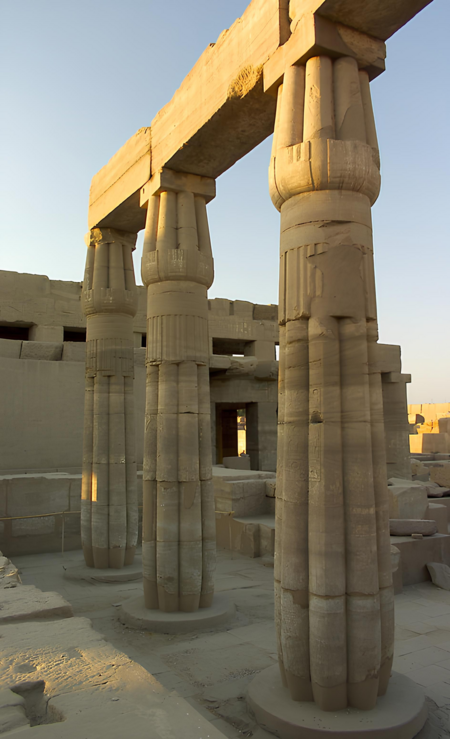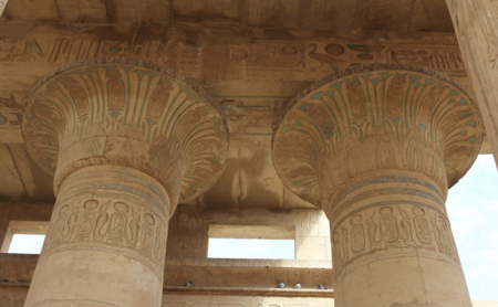 Флора долины Нила послужила основным декоративным мотивом для капителей и колонн храмов древнего Египта в целом. Популярными были цветок лотуса, папирус и пальмовые ветви. Для древних египтян эти растения несли в себе не просто декоративную функцию, а в первую очередь сакральное значение — символизировали жизнь и связь с природными циклами.