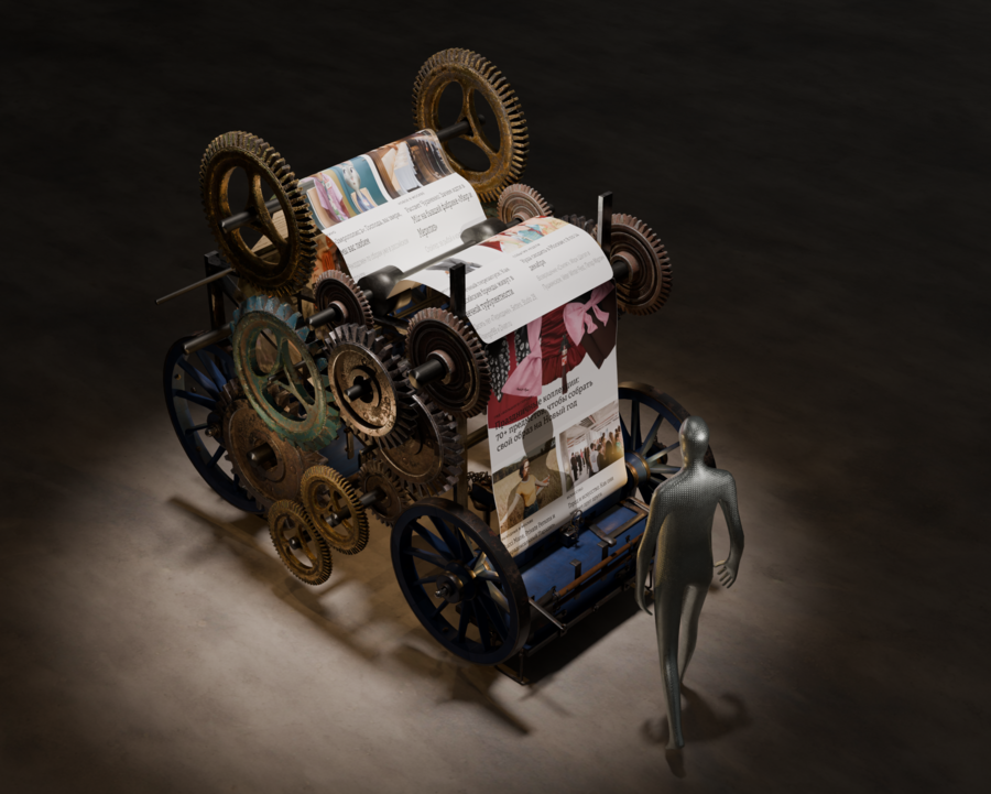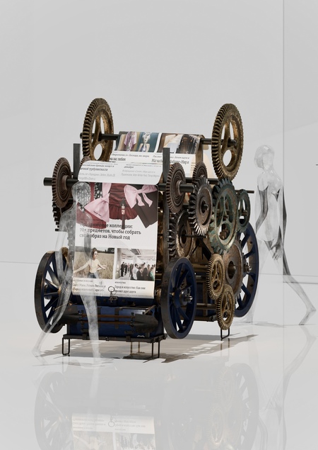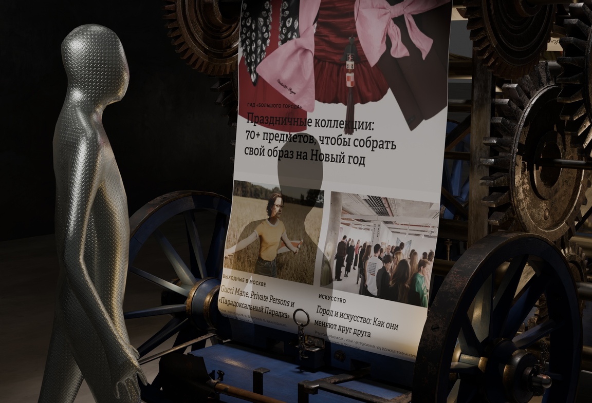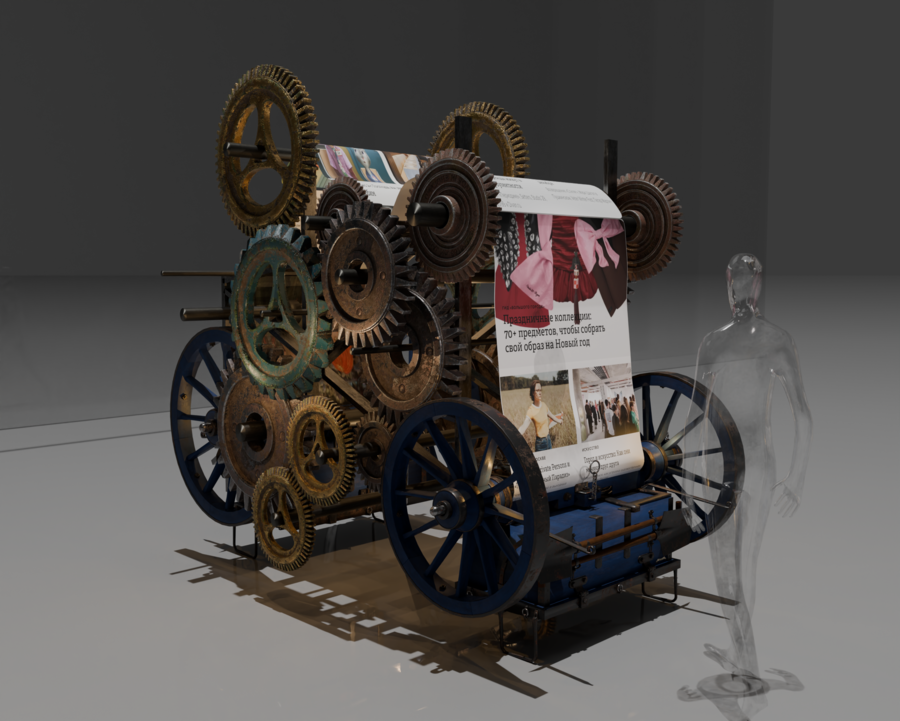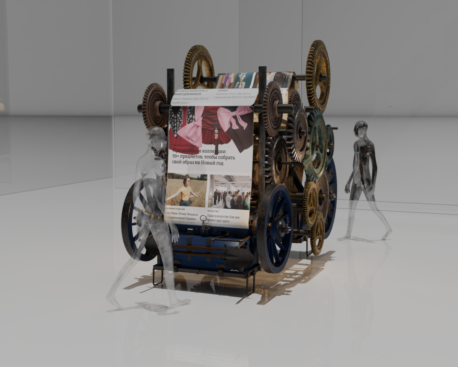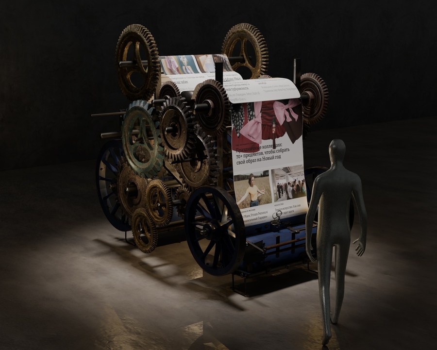 В рамках проекта «FeeD» передо мной стояла задача разработать стенд для участия в конкурсе интернет-журнала «Большой город». При его создании я вдохновлялся данными о том, что в процессе взаимодействия с интернет-ресурсами человек «проматывает» в среднем 1–1,5 метра алгоритмической ленты в день. Таким образом, родилась идея, в основе которой лежит метафора, подразумевающая, что за каждой публикацией стоит сложный «механизм», состоящий из множества мыслей, действий и случайных ситуаций, объединяющихся в общем временном и пространственном измерении. Каждое «движение» в этой цепочке влечёт за собой изменение последующих элементов информационной «конструкции».