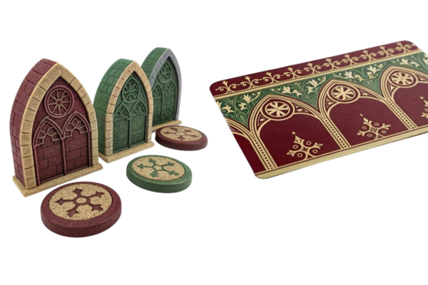 Создание носителей для логотипа в нейросети Recraft.Ai и Шедевруме, пример промпта: Сгенерируй элементы для настольной игры в готическом стиле: игровое поле, ароматические свечи в форме стрельчатых арок, декоративный платок, фишки-арки, кружку с горгульей и визитку с орнаментом. Используй глубокую бордово-зеленую палитру с песочными акцентами.