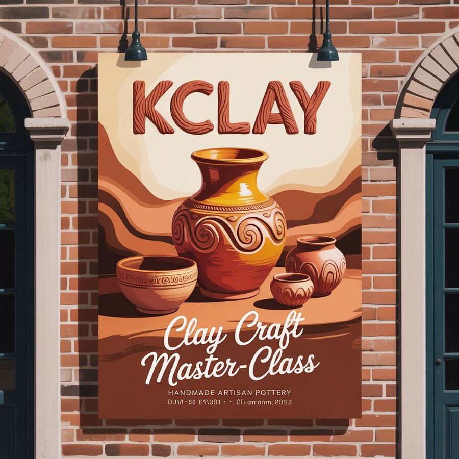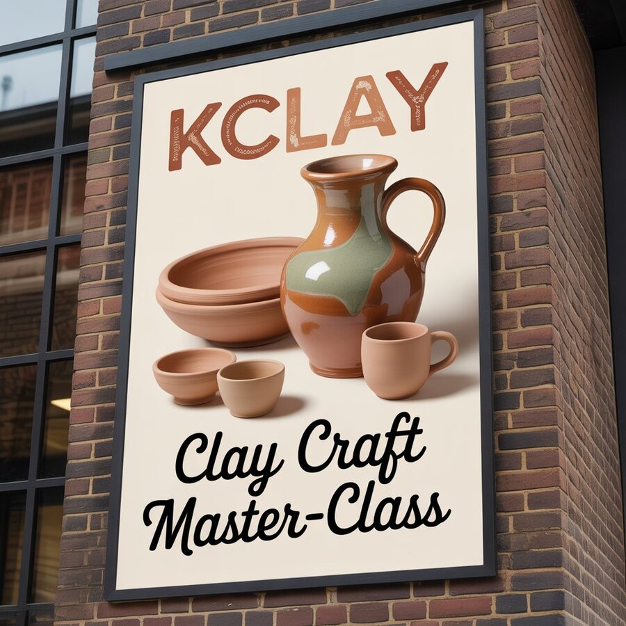 prompt 1: you are creating a brand named 'kclay', which sells home made clay crafts first of all you have to create a poster that is hanging on the building advertising your brand. on the poster you have to show any clay craft and some text like 'clay crfat master-class'