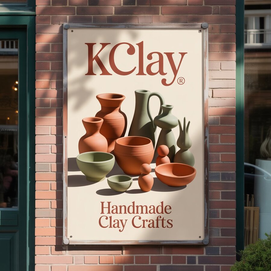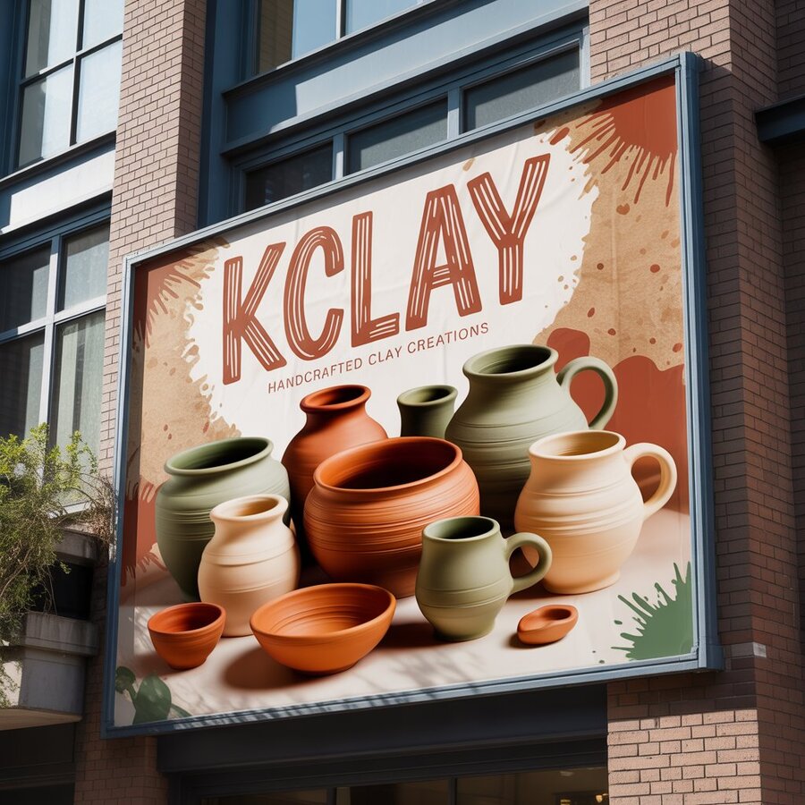 prompt 2: you are creating a brand named 'kclay', which sells home made clay crafts first of all you have to create a poster that is hanging on the building advertising your brand