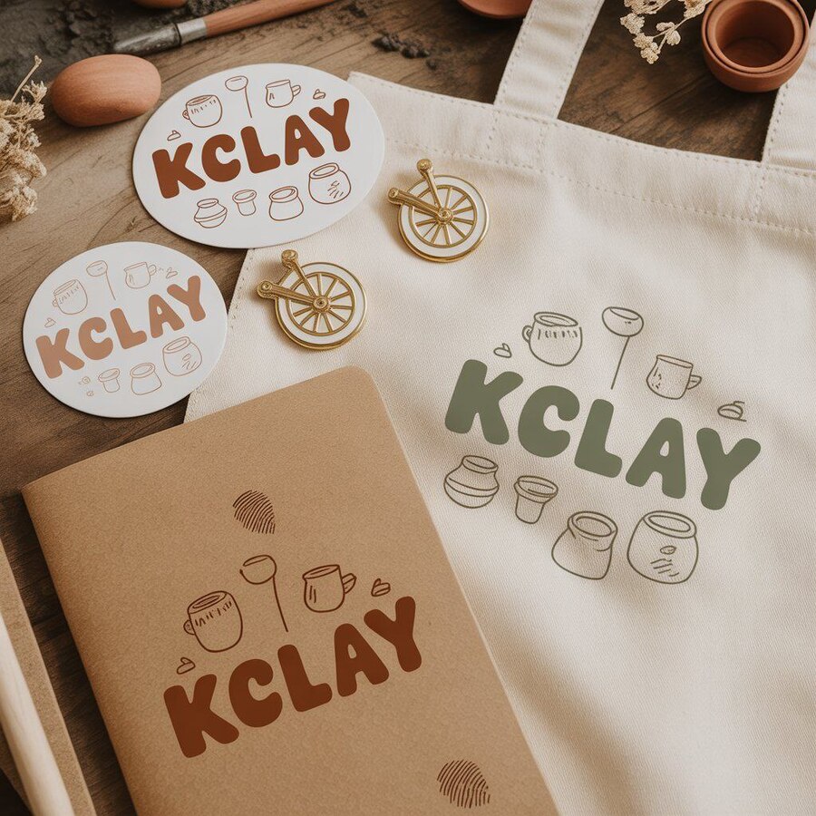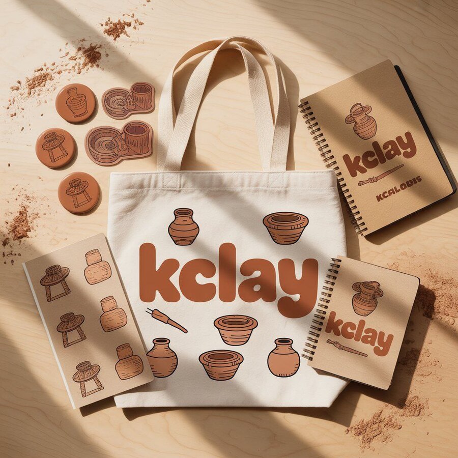 prompt 2: you are creating a brand named 'kclay', which sells home made clay crafts first of all you have to create different type of merch for the brand, for example stickers, pins, tote bags and notebooks