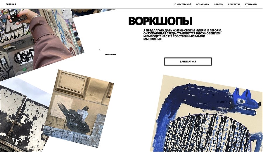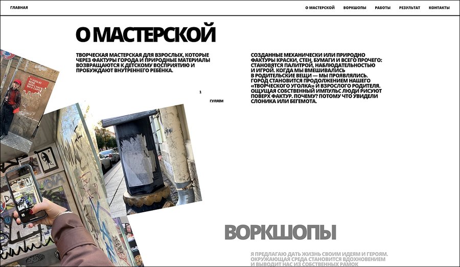 landing творческой мастерской для взрослых, которые через фактуры города и природные материалы — возвращаются к детскому восприятию и пробуждают внутреннего ребёнка.