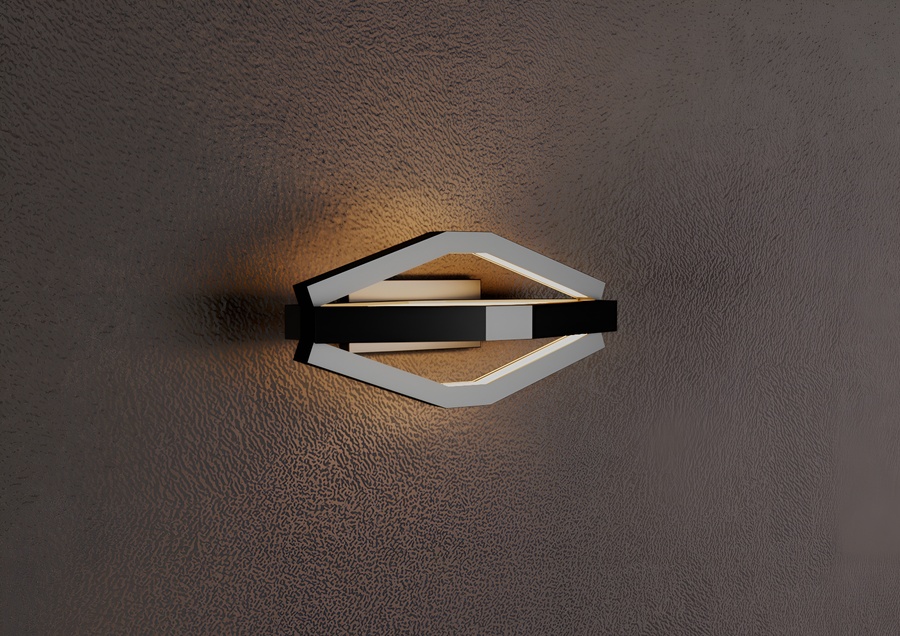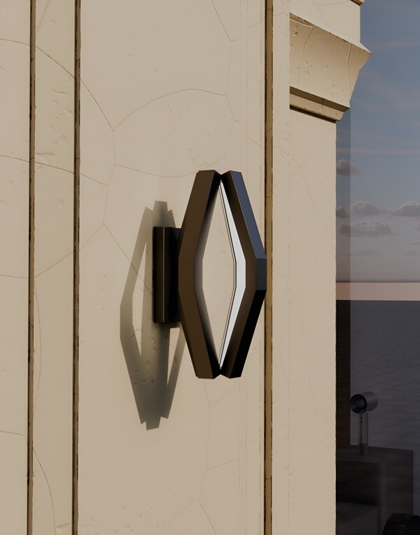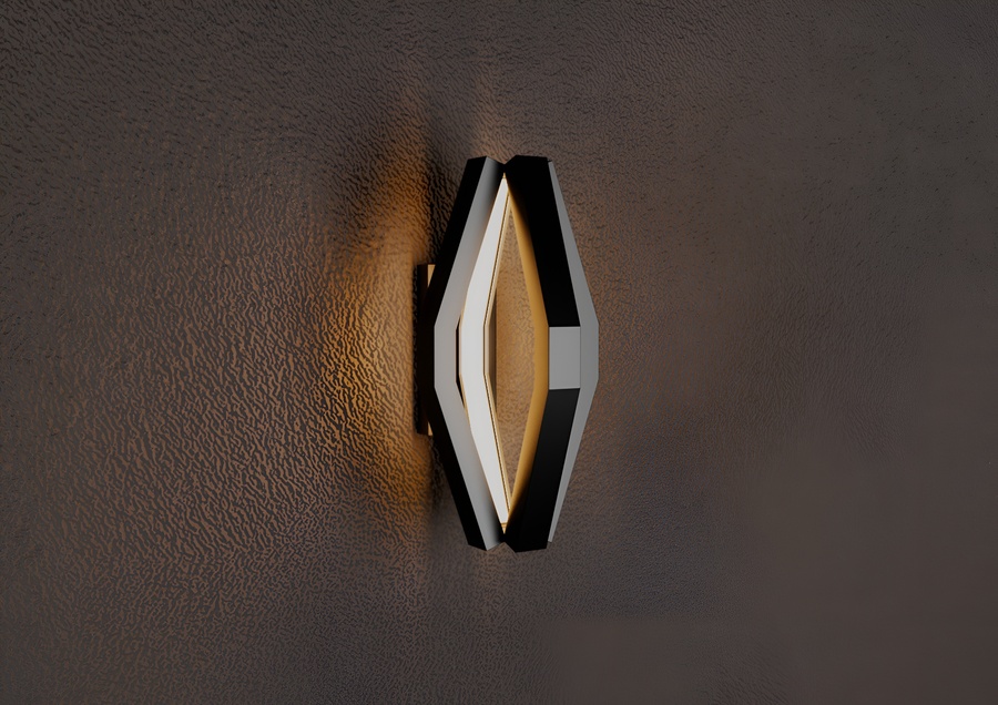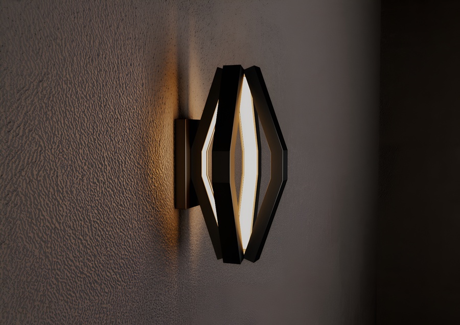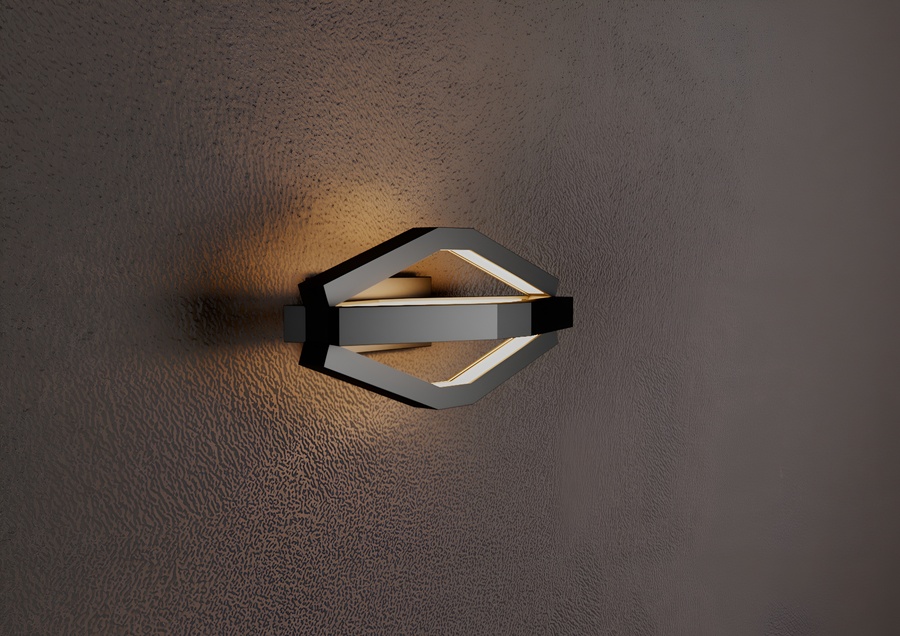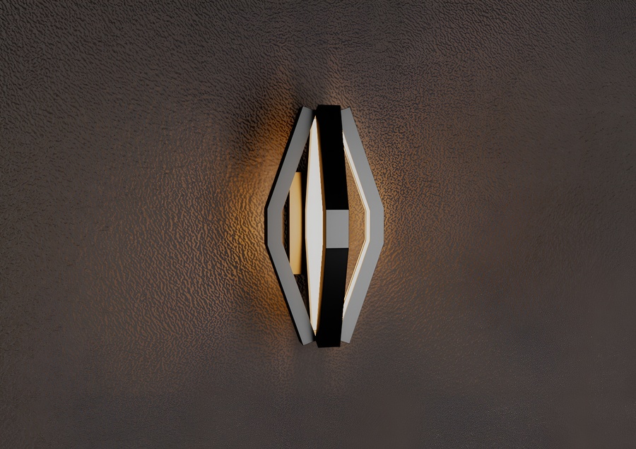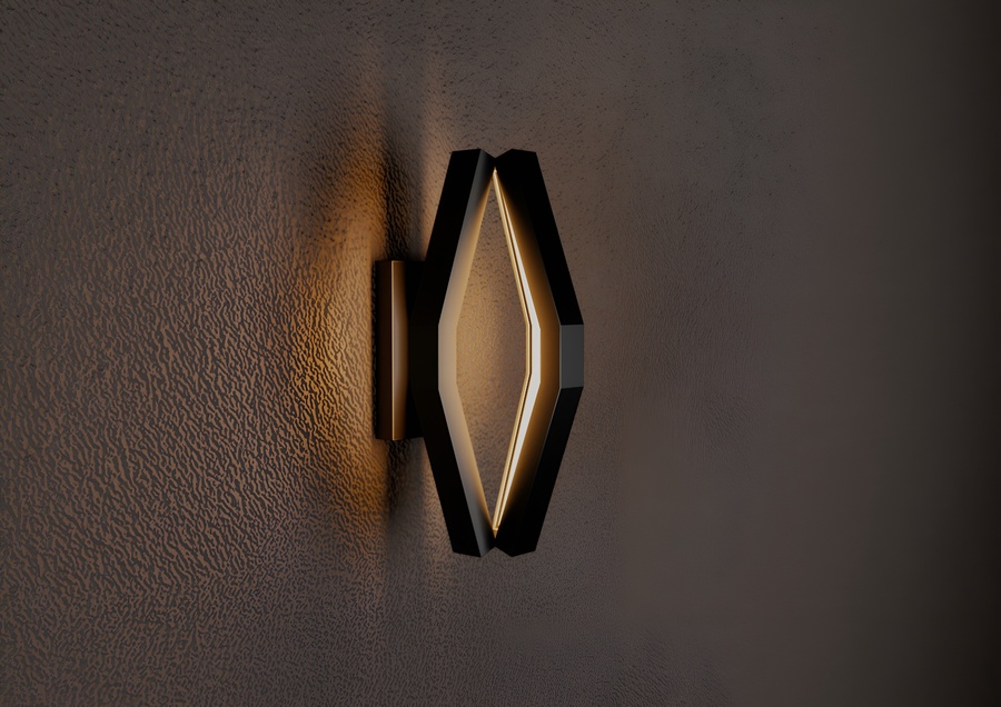 Корпус выполнен целиком из матового черного металла, образуя объемную многогранную форму, напоминающую вытянутый октаэдр. Внутри граней сделан вырез, в котором размещен светорассеиватель, специально разработанный для алюминиевого LED-профиля. Рассеиватель обеспечивает равномерное, мягкое распределение теплого света, создавая эффект комфорта и уюта.