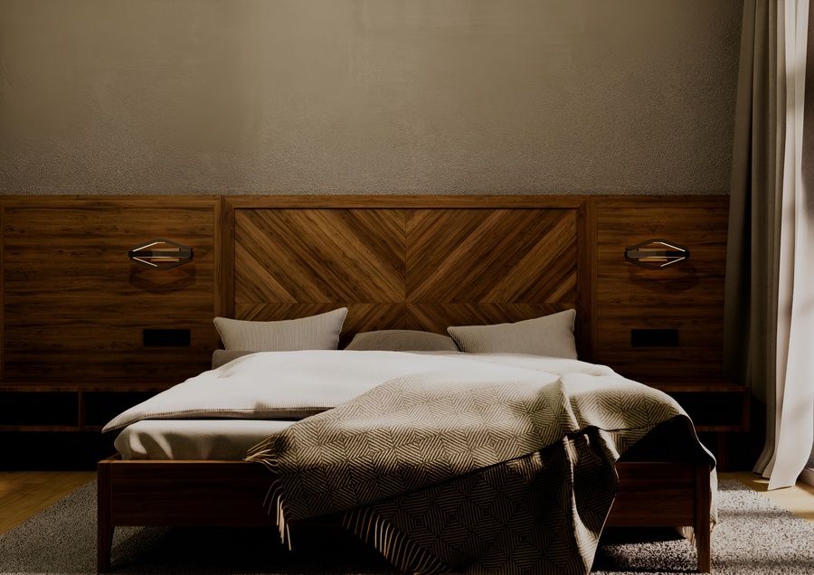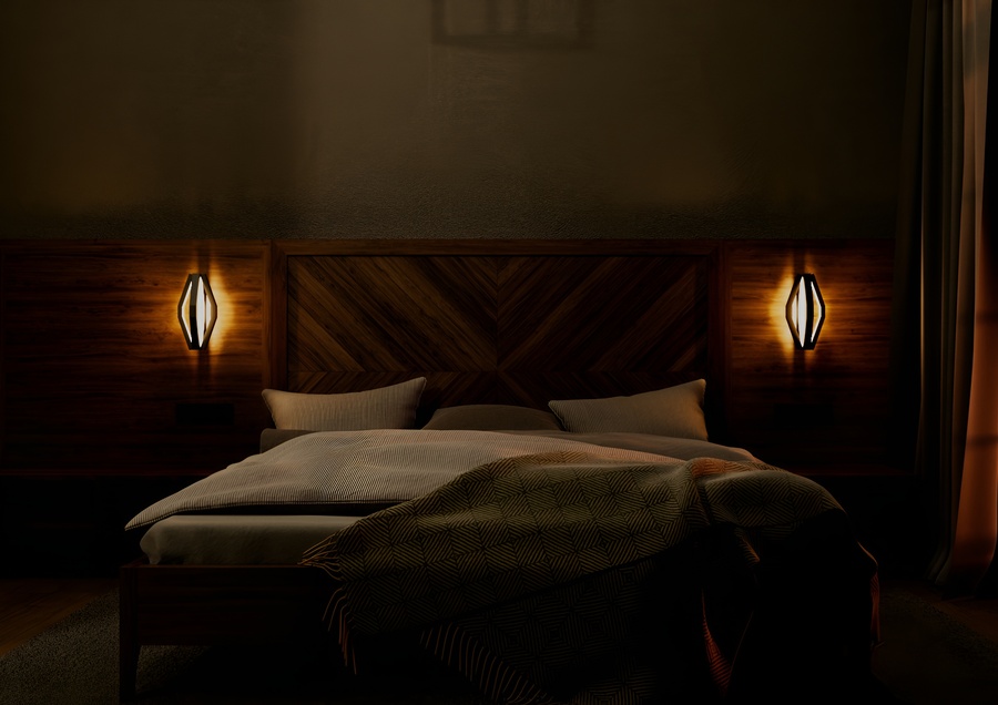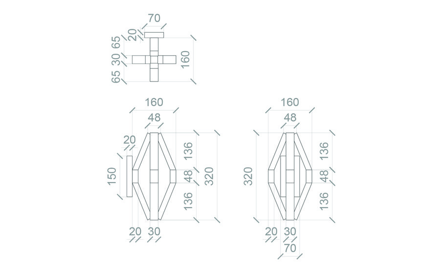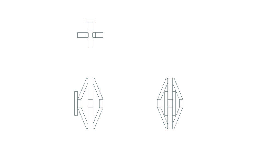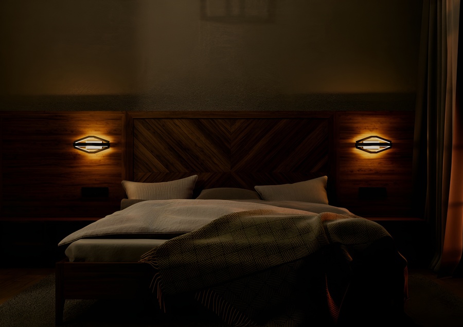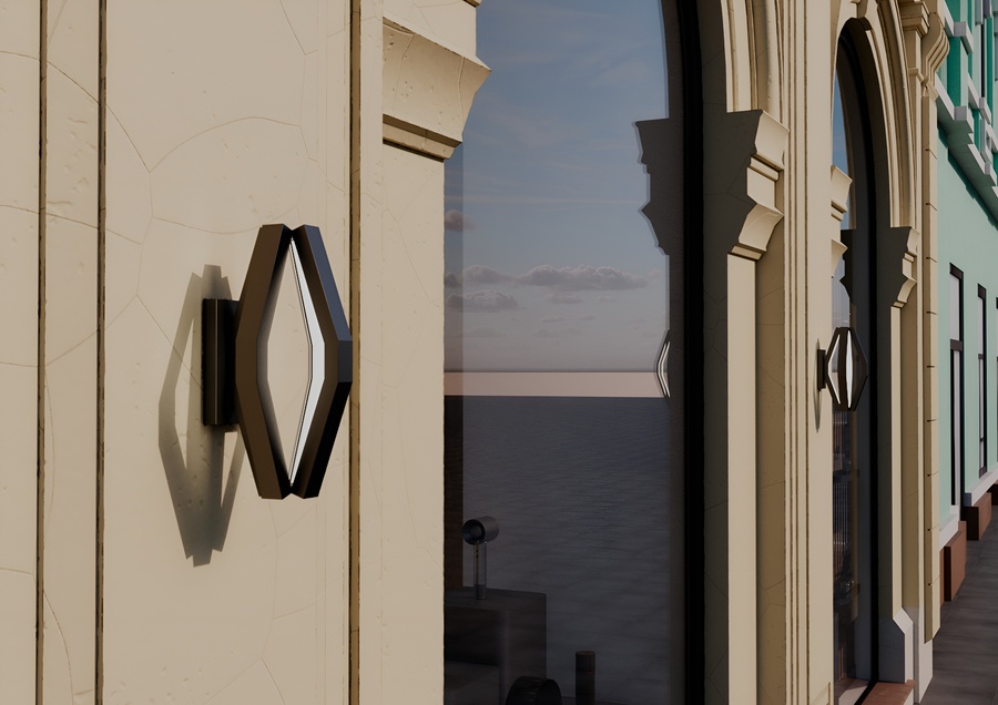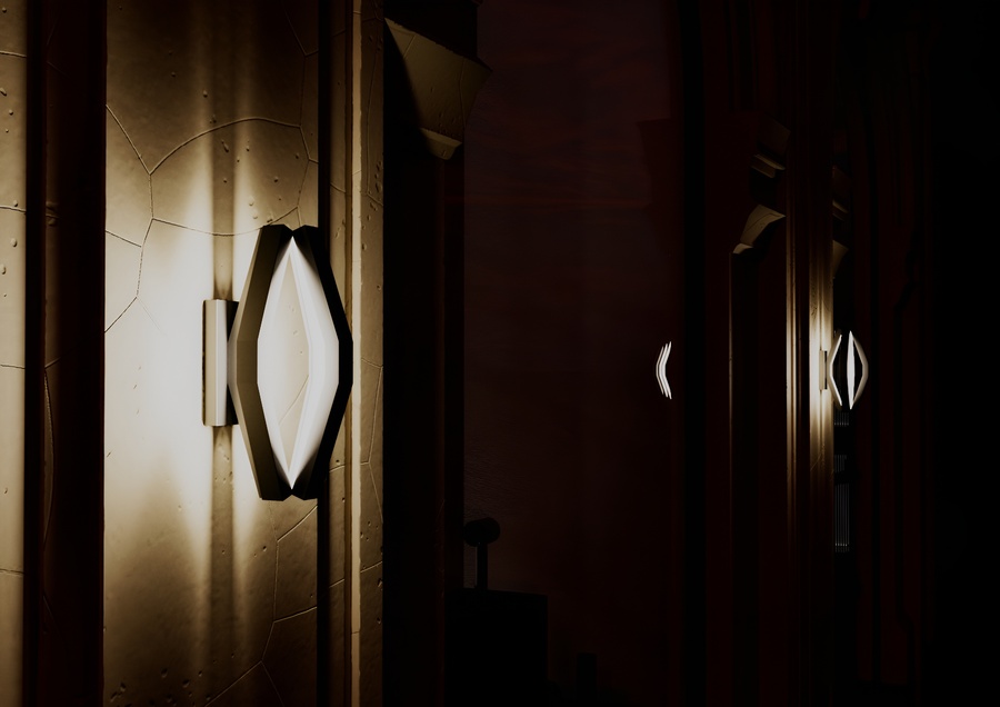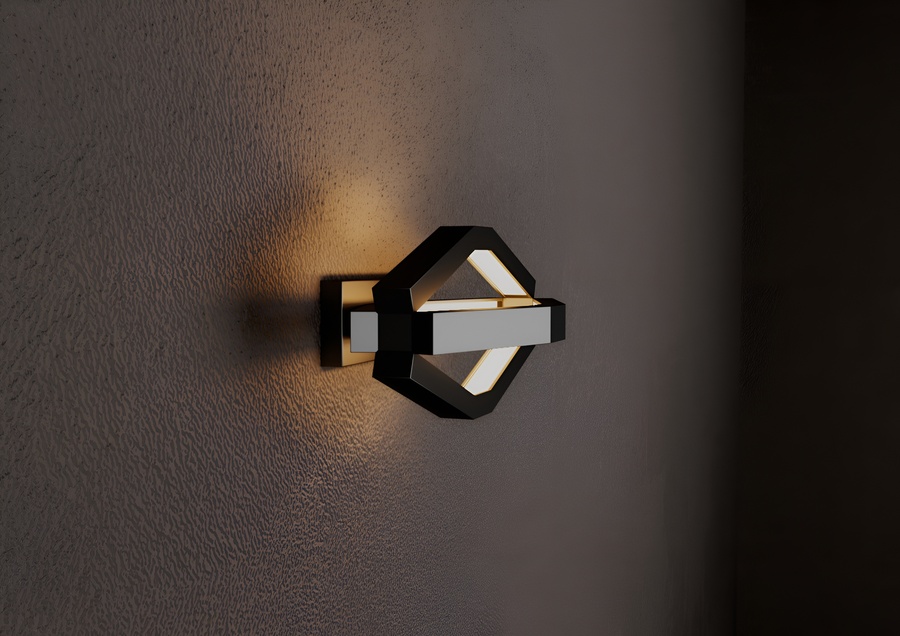 Корпус выполнен целиком из матового черного металла, образуя объемную многогранную форму, напоминающую вытянутый октаэдр. Внутри граней сделан вырез, в котором размещен светорассеиватель, специально разработанный для алюминиевого LED-профиля. Рассеиватель обеспечивает равномерное, мягкое распределение теплого света, создавая эффект комфорта и уюта.
