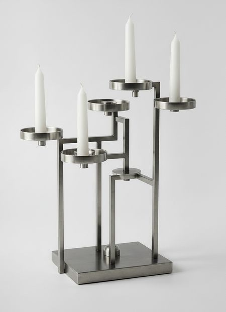 Серия металлических канделябров представляет собой предметы на границе функционального объекта и скульптуры. Формообразование основано на принципах супрематизма: простые геометрические элементы, ясная структура, отказ от декоративности. Канделябр рассматривается как пространственная композиция из линий и объемов, где свеча становится частью архитектуры объекта.