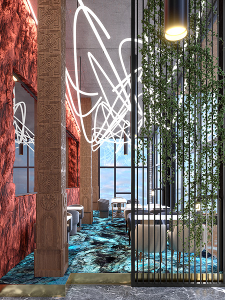 Ресторан ГАМА в Махачкале площадью 315 кв. м. представляет собой авторскую концепцию, сочетающую локальную идентичность с современной эстетикой. Пространство воплощает контраст природных стихий через фактурный камень, монументальные формы, переосмысленные орнаменты в резных деревянных колоннах и яркие акценты красных деревьев.