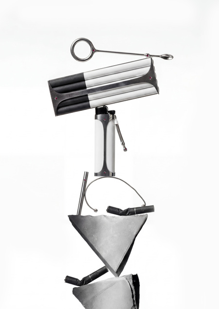 В дизайне я хотела изобразить обтекаемость и простоту форм, но в то же время акцентировать внимание на маленькой детале — надежде на прекращение коллекционирования собственного образа курильщика — инкрустация красными камнями с вырубкой искры у посадочных мест.