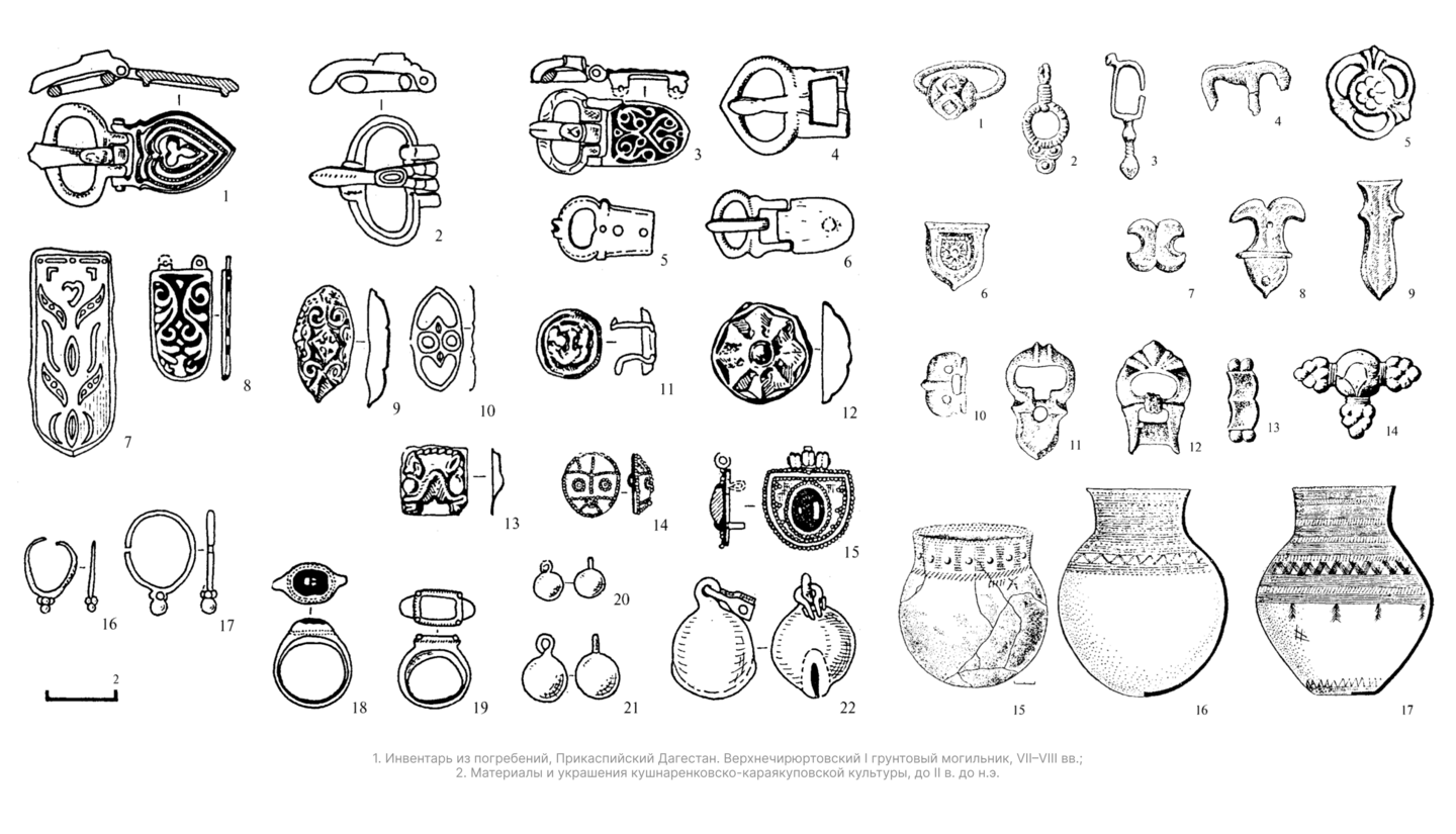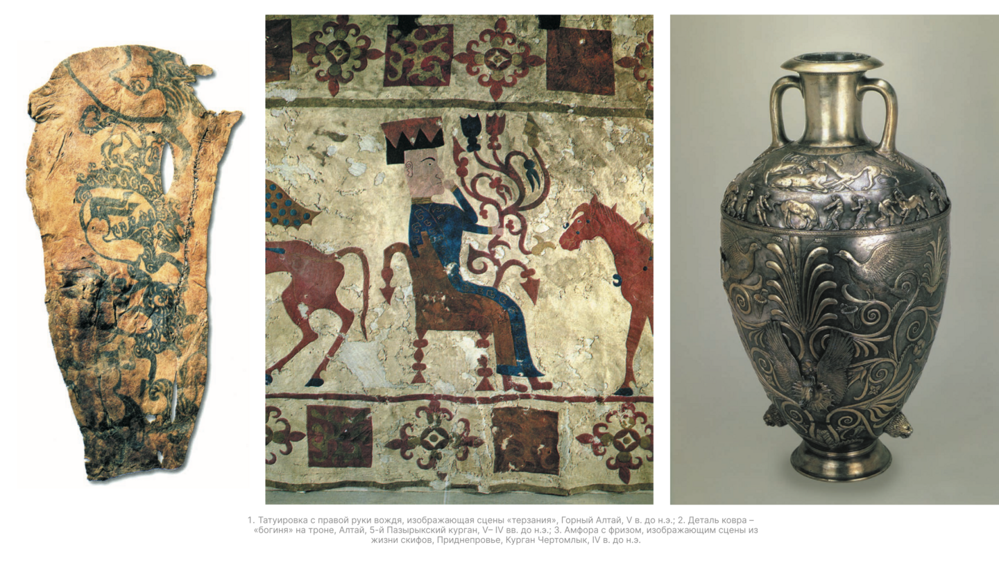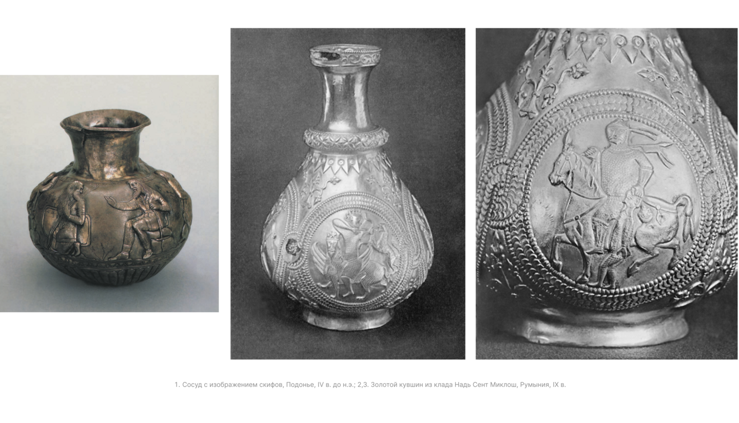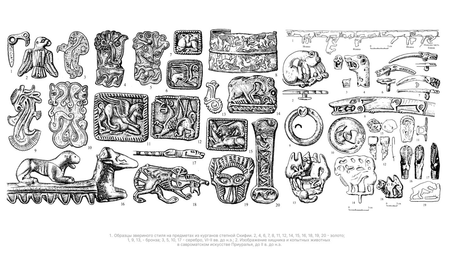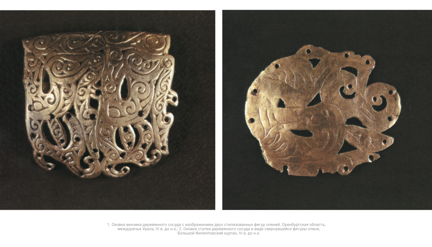 Орнамент Украшения и предметы из серебра, металла, кожи, текстиля того времени часто декорированы в стиле, который сейчас обычно называют — «звериный стиль». Животные мотивы, гибридные фантастические существа и стилизованные природные формы использовались как универсальный визуальный язык степных культур.