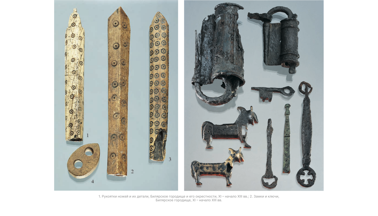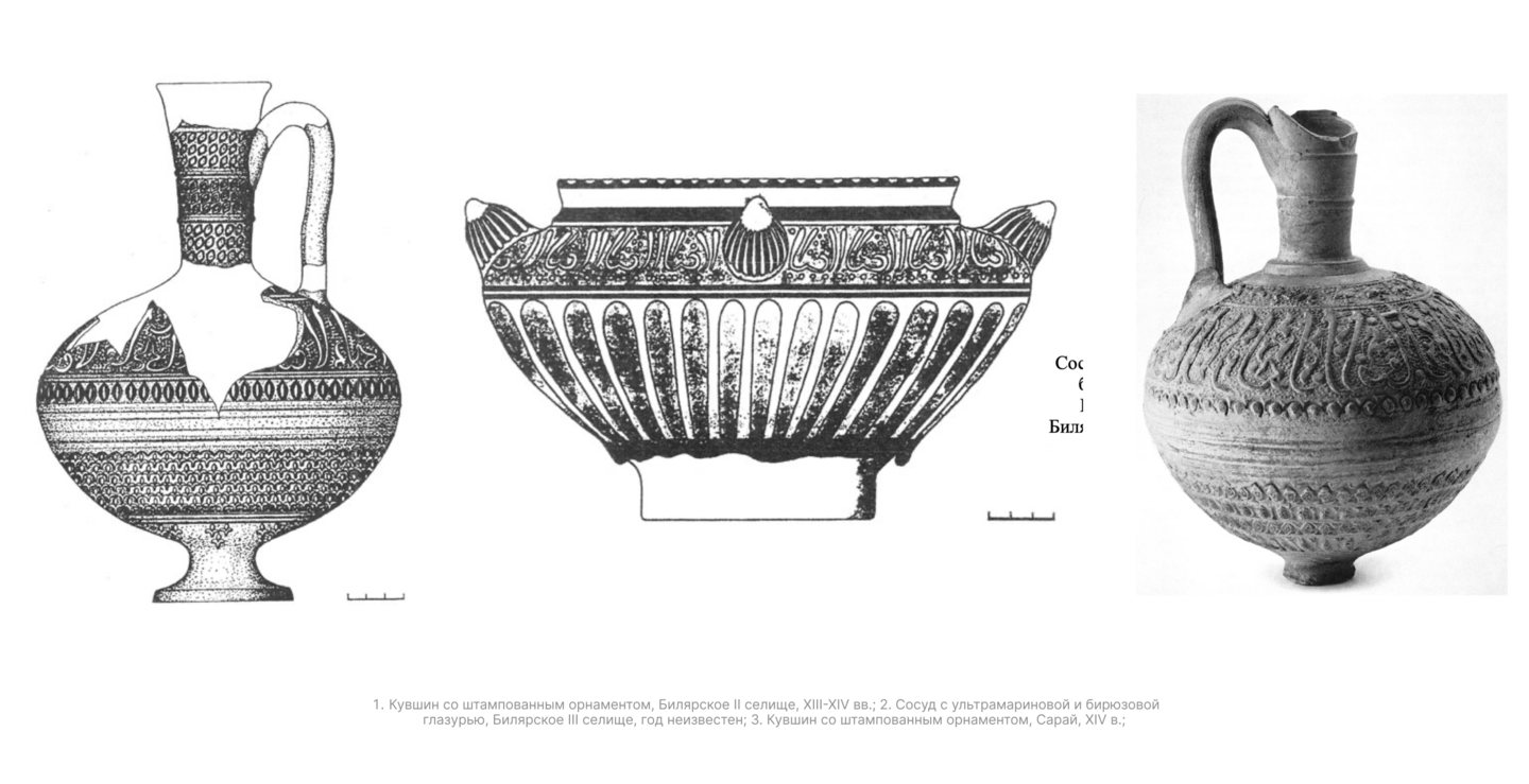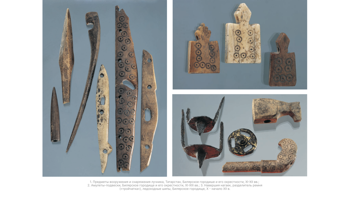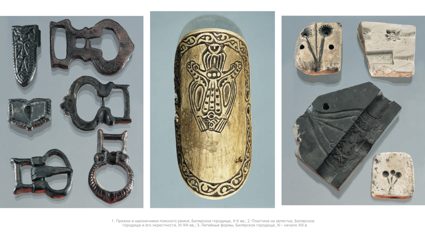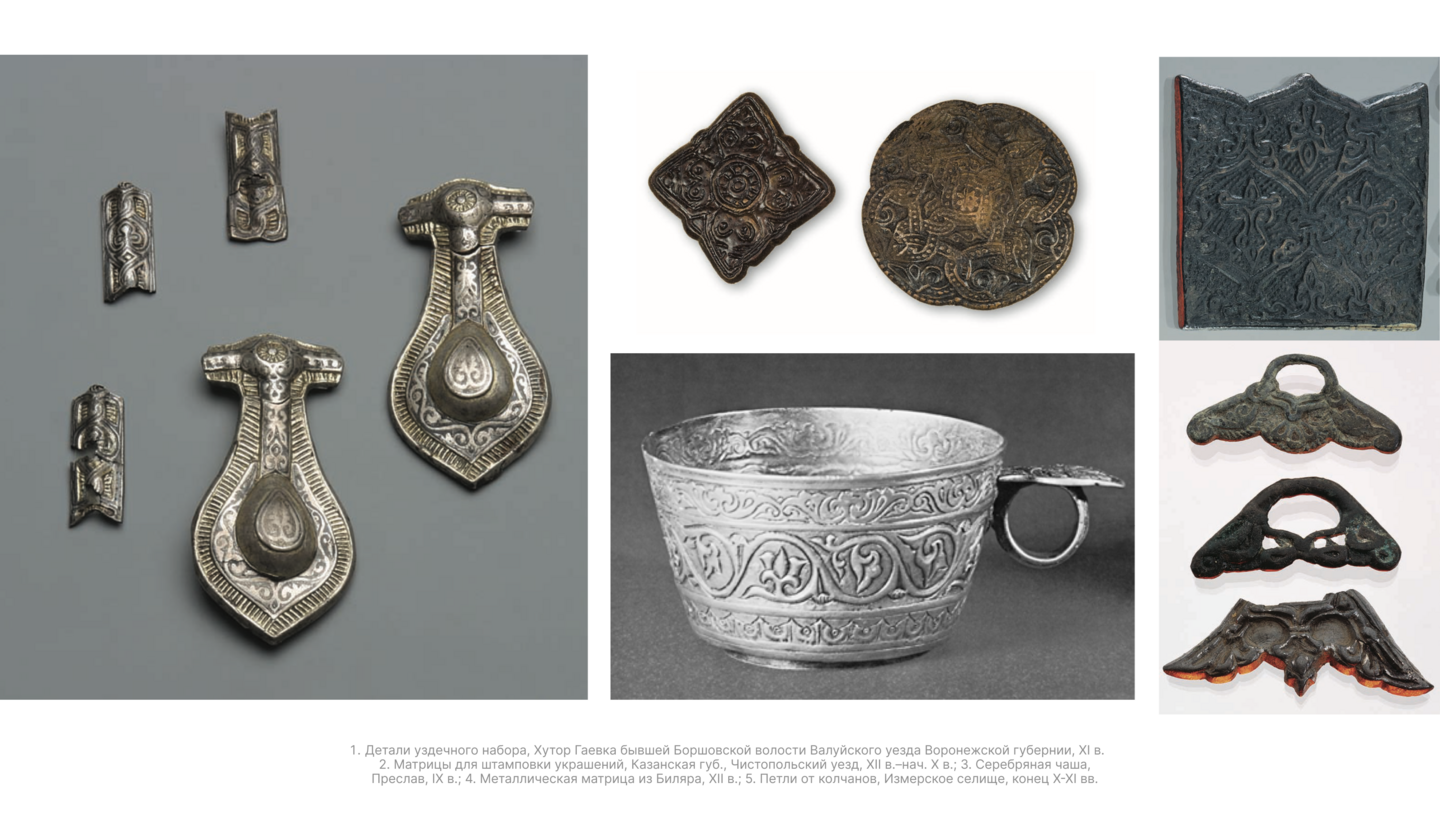 Согласно исследованиям [1], изделия Волжской Булгарии демонстрируют сочетание — с одной стороны — тюркско-степных традиций, с другой — влияний ремесленных школ Центральной Азии: металлообработка, ниелло, филигрань, плотные геометрические и зооморфные композиции.