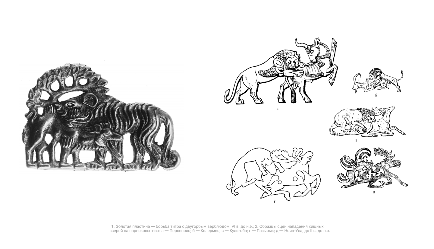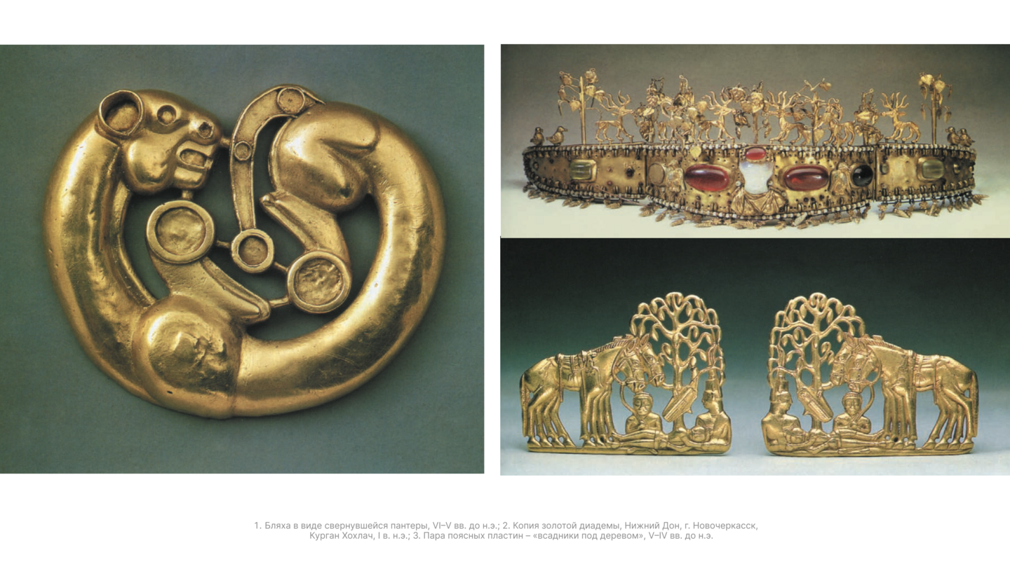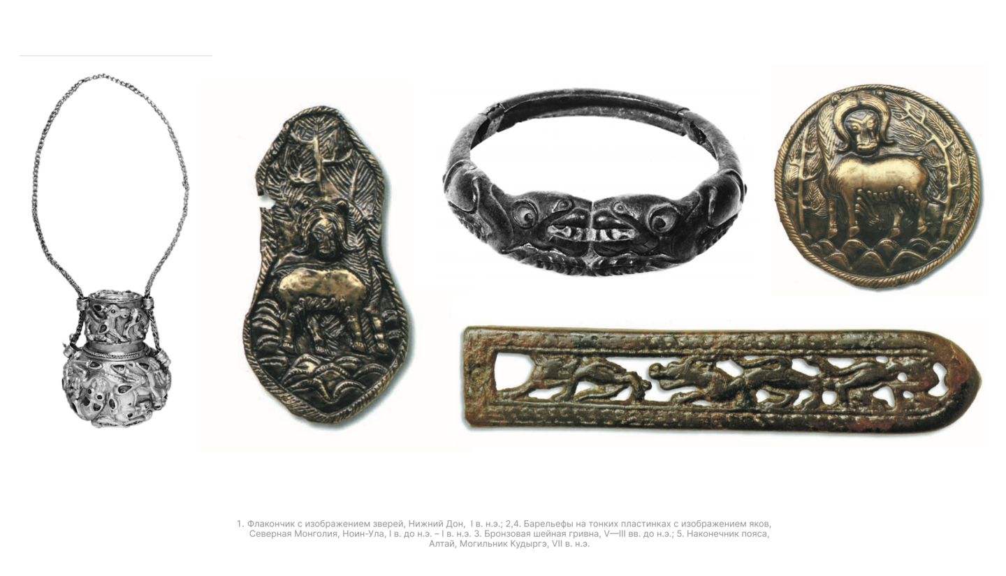 Звериные мотивы Помимо образа коня, широко использовались изображения таких животных, как барс (леопард), волк, птицы, медведь, олень, собака, а также мифические и стилизованные звери. Эти образы символизировали силу, защиту, власть и связь с природой и духами.​ Животные часто воспринимались как тотемы родов или племен, а также как силы, которые, предполагалось, защищали носителя украшения.