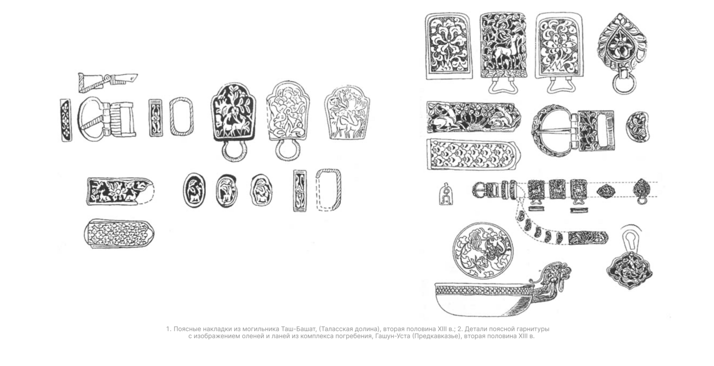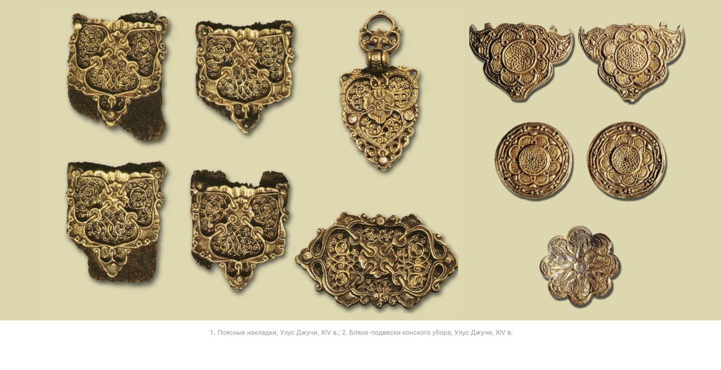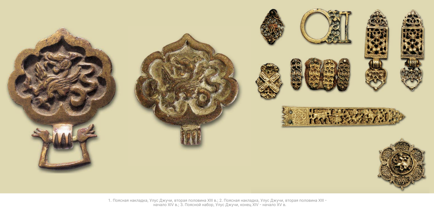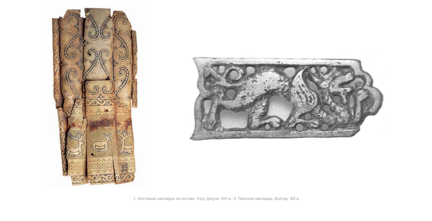 Новые зооморфные образы В Золотой Орде зооморфные мотивы получают новое развитие: ордынские мастера возрождают степной звериный стиль, используя оленей, птиц, хищников и фантастических существ в ювелирных изделиях, бляхах и предметах одежды, при этом смысл изображений меняется: если у ранних кочевников они были тотемными и обережными, то в Орде становятся скорее знаками статуса и декоративными символами, отражающими вкус.