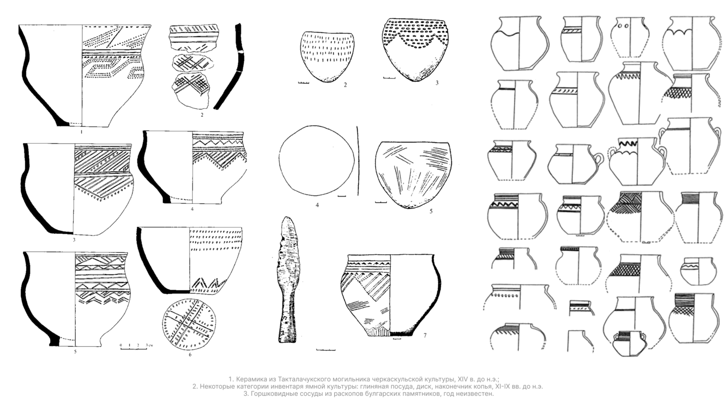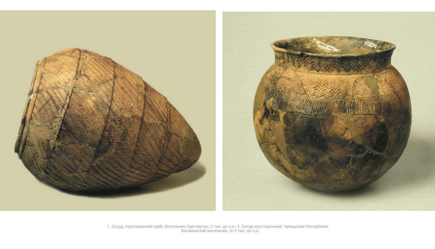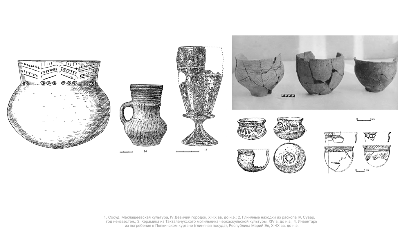 Керамические сосуды Основными типами посуды были горшковидные сосуды с широким распахнутым горлом и раздутым туловом, кувшинообразные с более высоким узким горлом, чаши и блюда. Для повседневного использования характерны были простые формы, чаще округлые и с толстыми стенками.