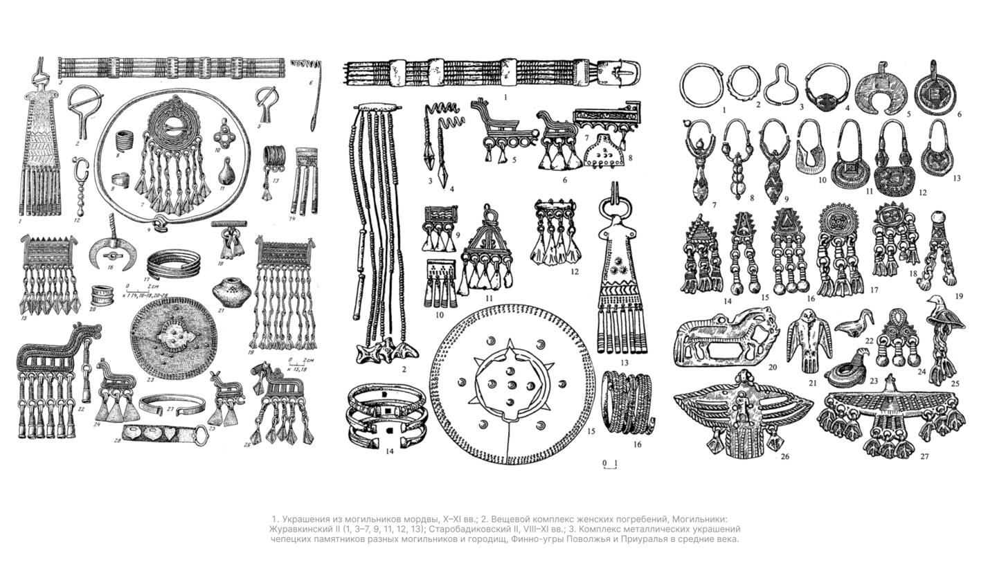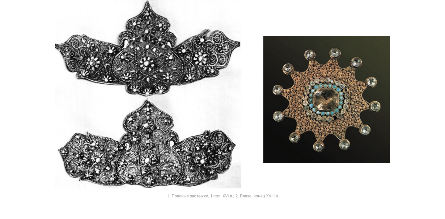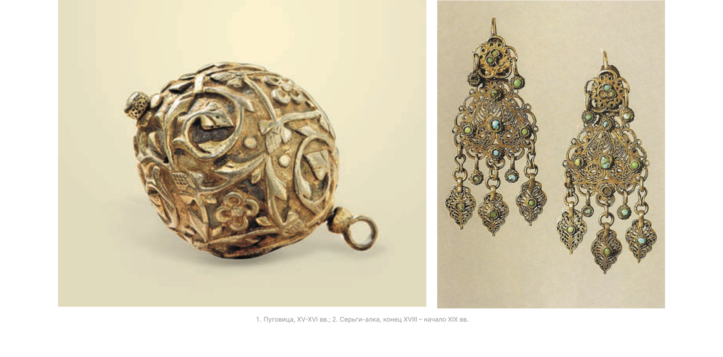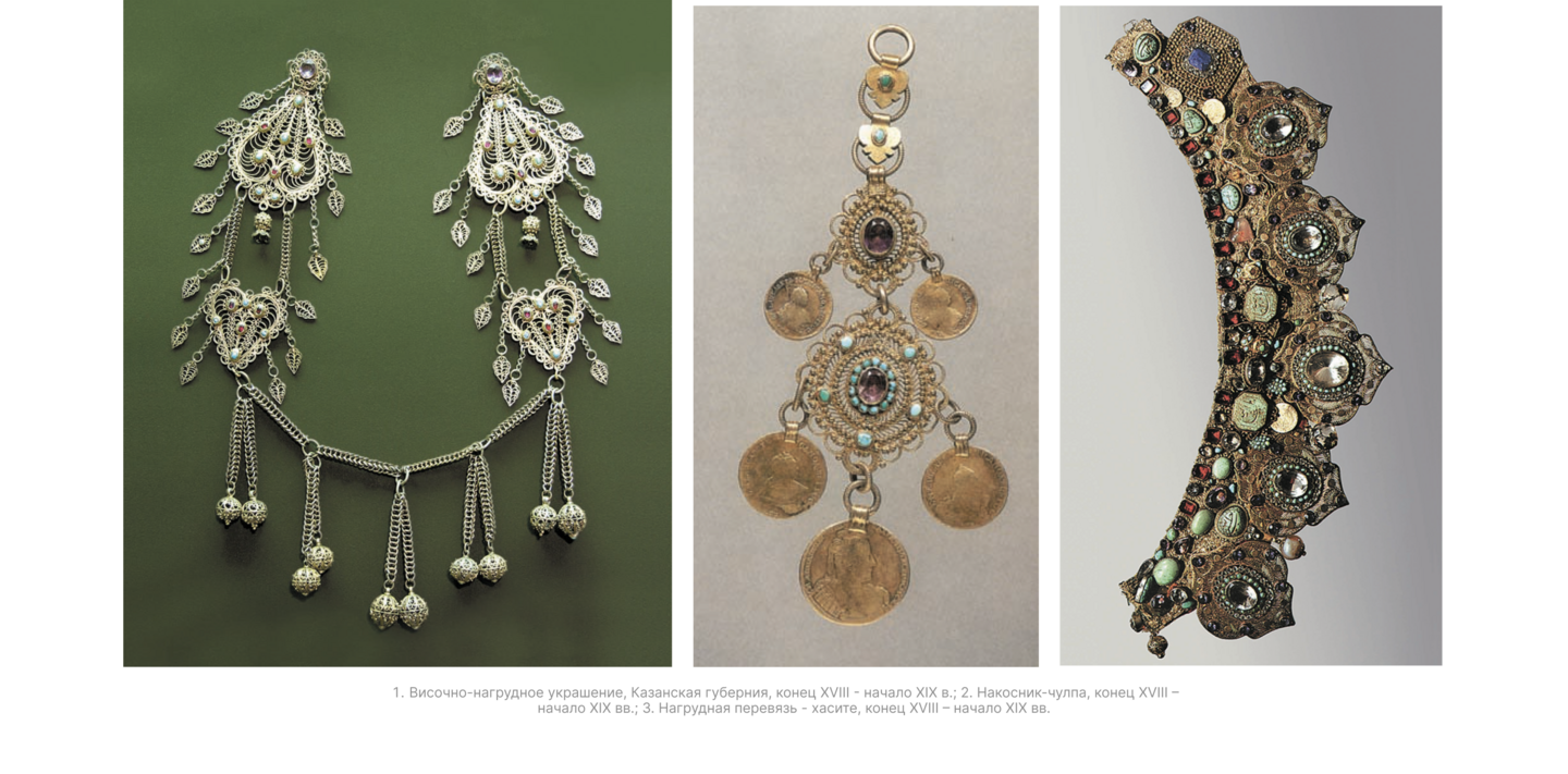 Украшения — ювелирные, металлические, с позолотой, бисером и аппликациями — тоже сохраняли орнаментальные традиции, что давало образу торжественность, символизировало статус и культурную принадлежность.
