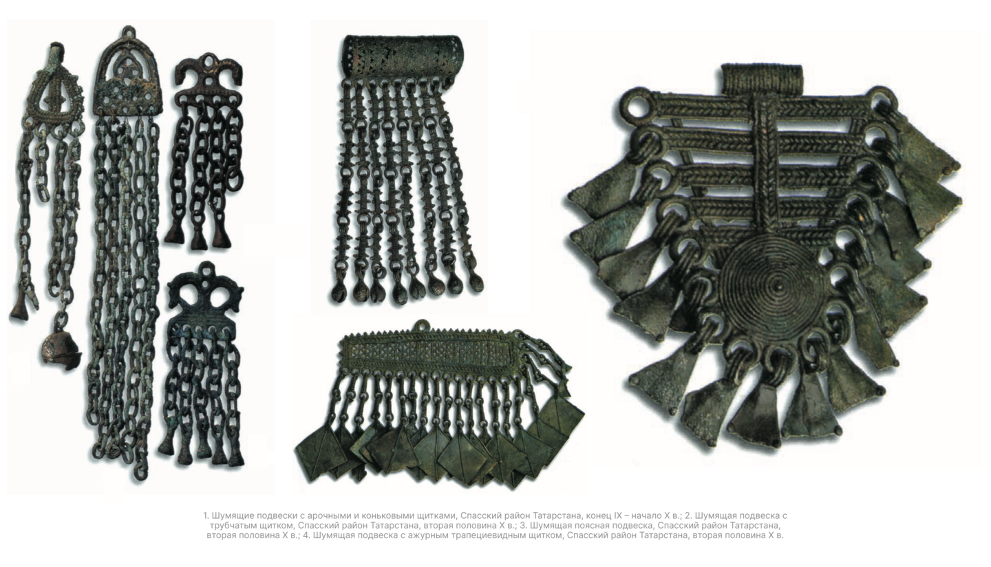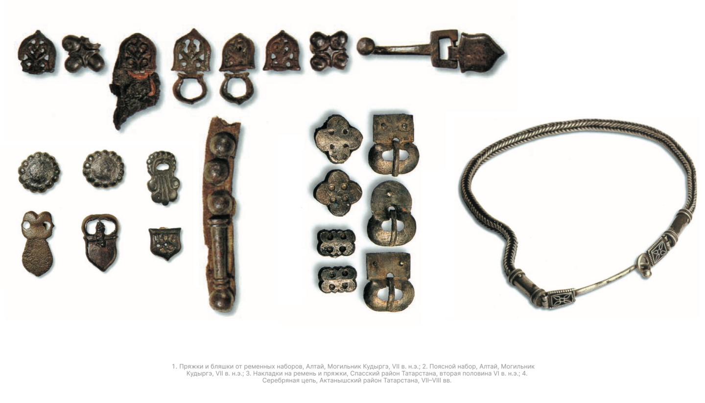 Украшения В этот период украшения играли важную роль в выражении статуса, рода и мировоззрения. Для степных тюрков характерны шумящие подвески — наборы металлических пластин и колец, звенящих при движении. Их звук считался защитным, отгоняющим злых духов, поэтому такие украшения выступали элементом оберега. Украшения визуально можно разделить на две категории: орнаментальные и зооморфные.