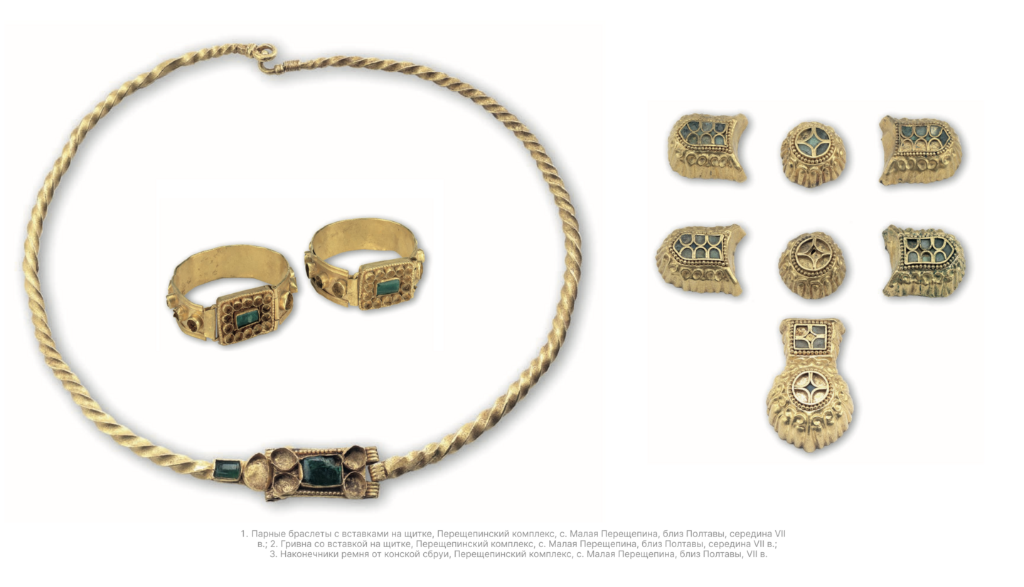 Сочетание золота, которое само по себе является культурным маркером культуры, и драгоценных камней (чаще зеленого оттенка: изумруд, малахит, глазурь) или полудрагоценного материала работали как знак богатства: даже если сама вещь была небольшой, сочетание материалов говорило о статусе владельца.