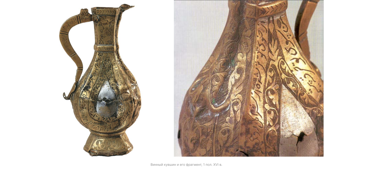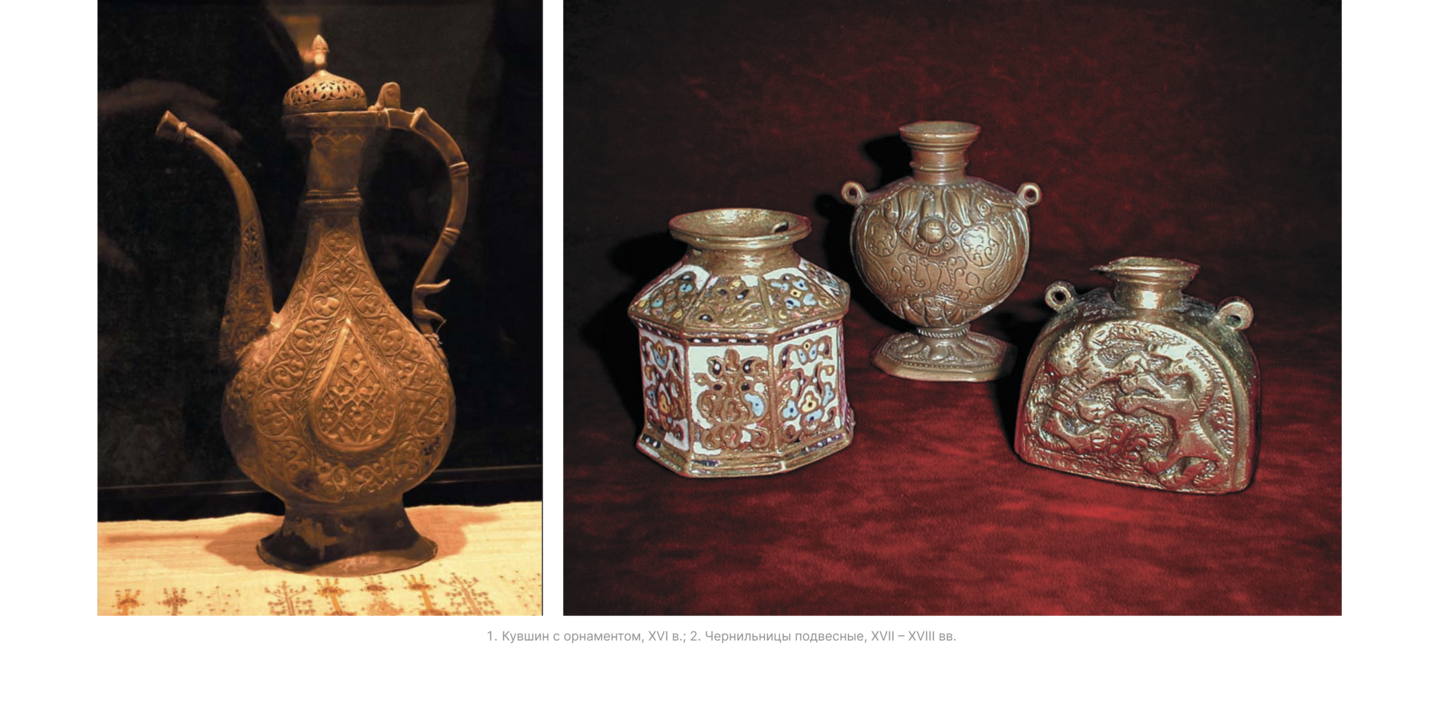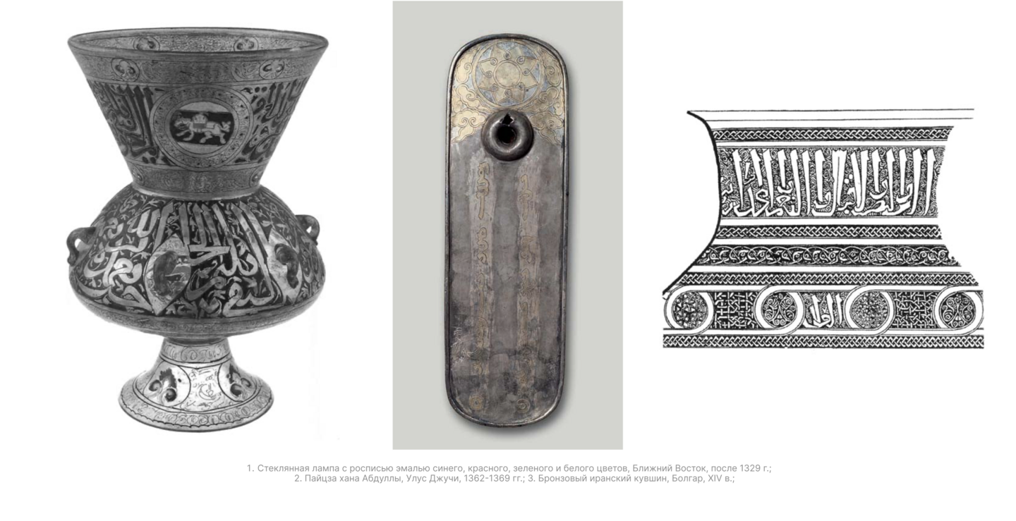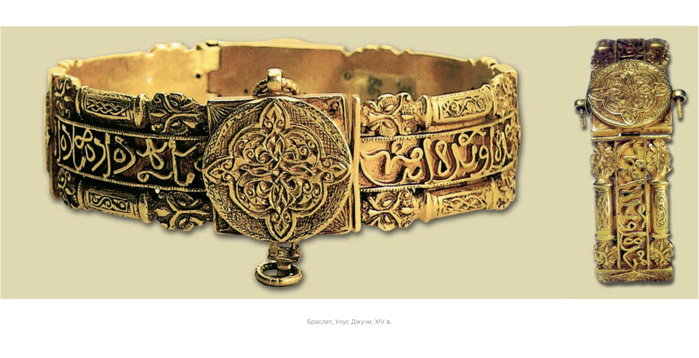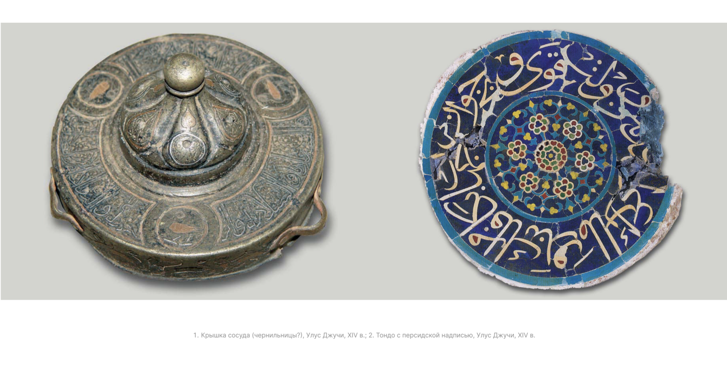 Орнамент и письменность В ордынской культуре письменность — арабская графика (и тюркские тексты на арабском письме) — широко использовалась не только для информационных носителей и монет, но и как декоративный орнамент. Например, на сосудах, керамике и металлических изделиях орнамент иногда сочетал растительные, геометрические мотивы и эпиграфику: надписи, арабские буквы или даже молитвенные мотивы — вписанные в орнаментальные пояса вокруг сосудов — превращались в декоративные элементы.