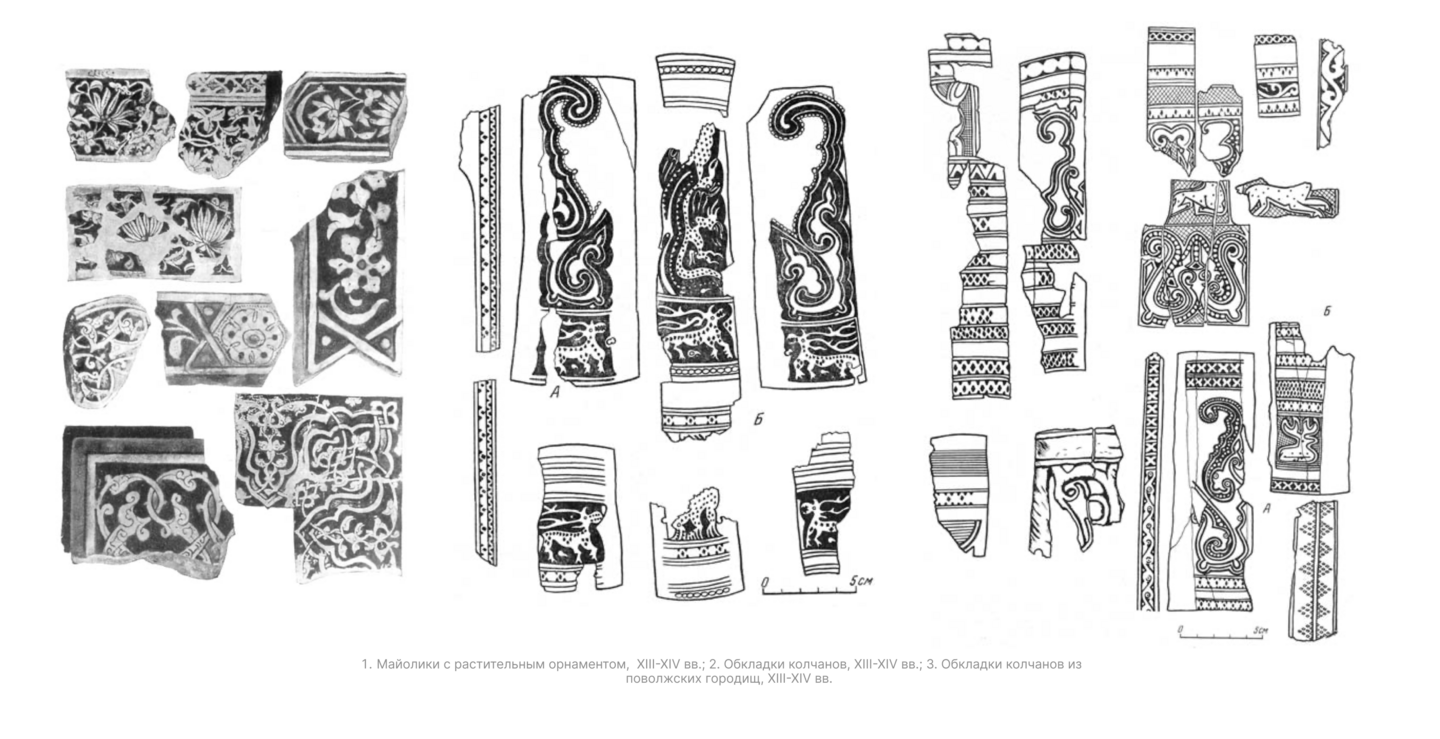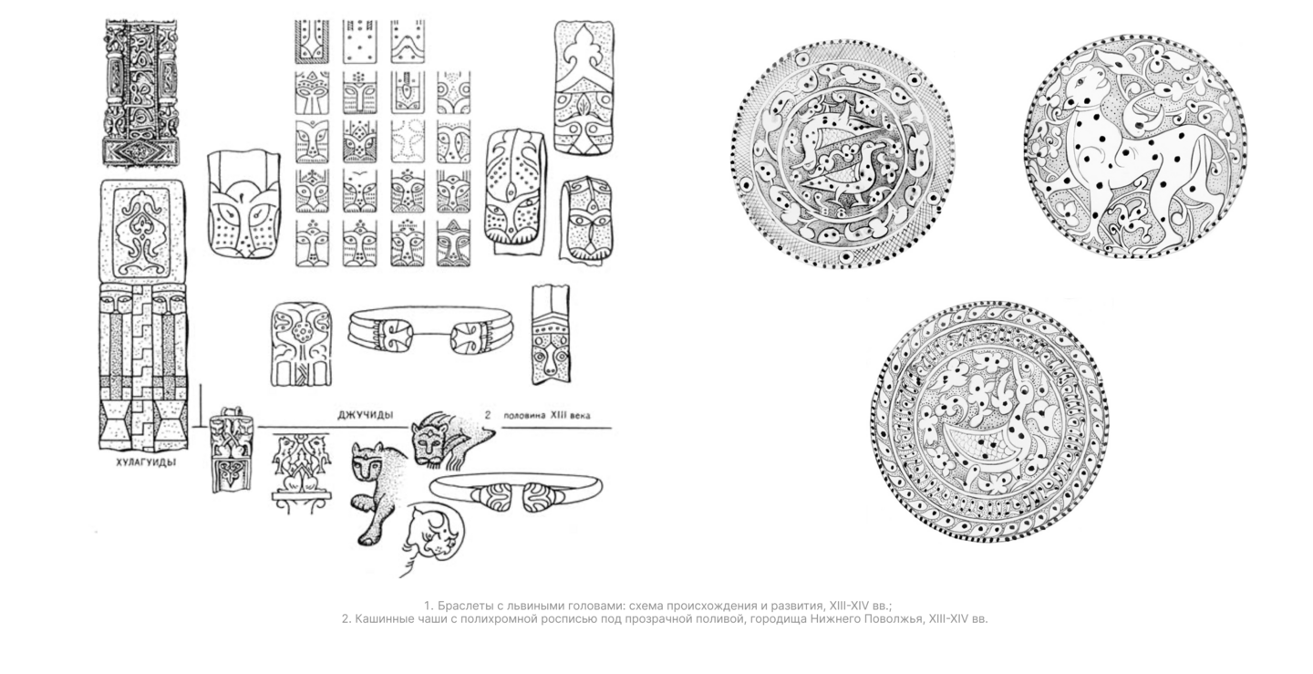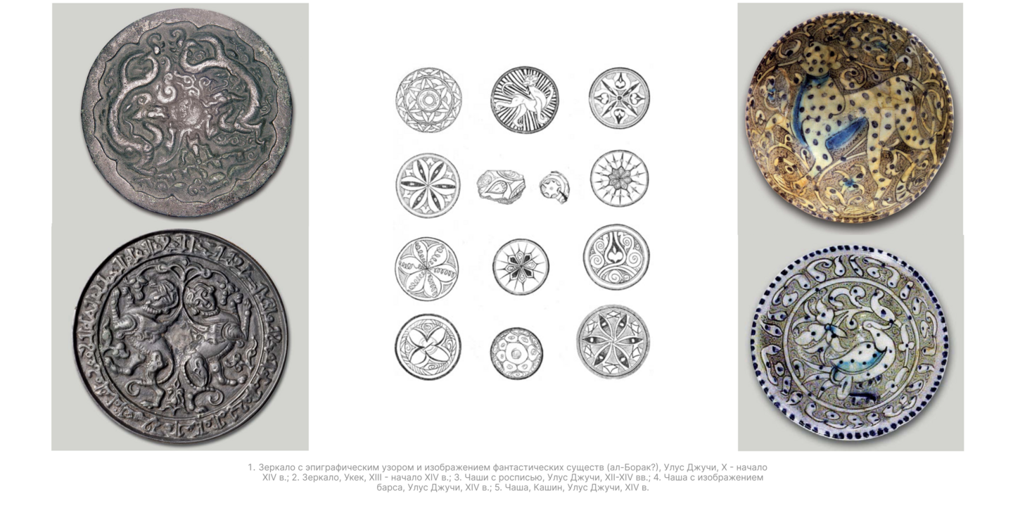 Появляются и новые мотивы, например, лев и более сложные образы птиц, что связано с широкими культурными контактами Орды с исламским Востоком и Центральной Азией. На керамике и предметах быта зооморфные сюжеты становятся более разнообразными и стилизованными, иногда объединяя животные формы с растительными линиями.
