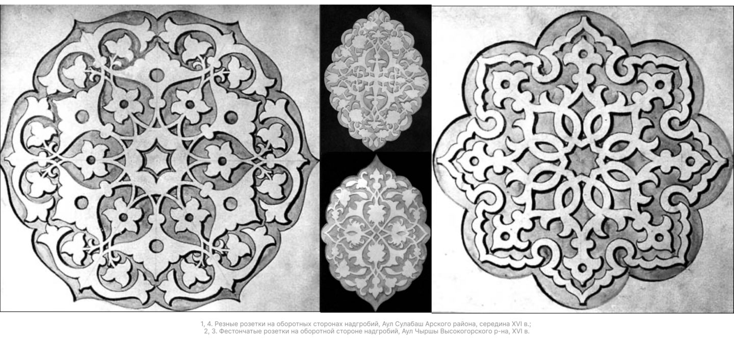 Надгробия В татарской культуре именно надгробия стали той сферой, где орнамент лучше всего сохранялся. Каменные «каберташ» — резные надгробные плиты — изготавливались из прочных материалов и служили носителями как эпитафий на арабском письме, так и декоративных мотивов. Наиболее распространены растительные и геометрические орнаменты: тюльпаны, листья, виноградная лоза, плетёные бордюры.
