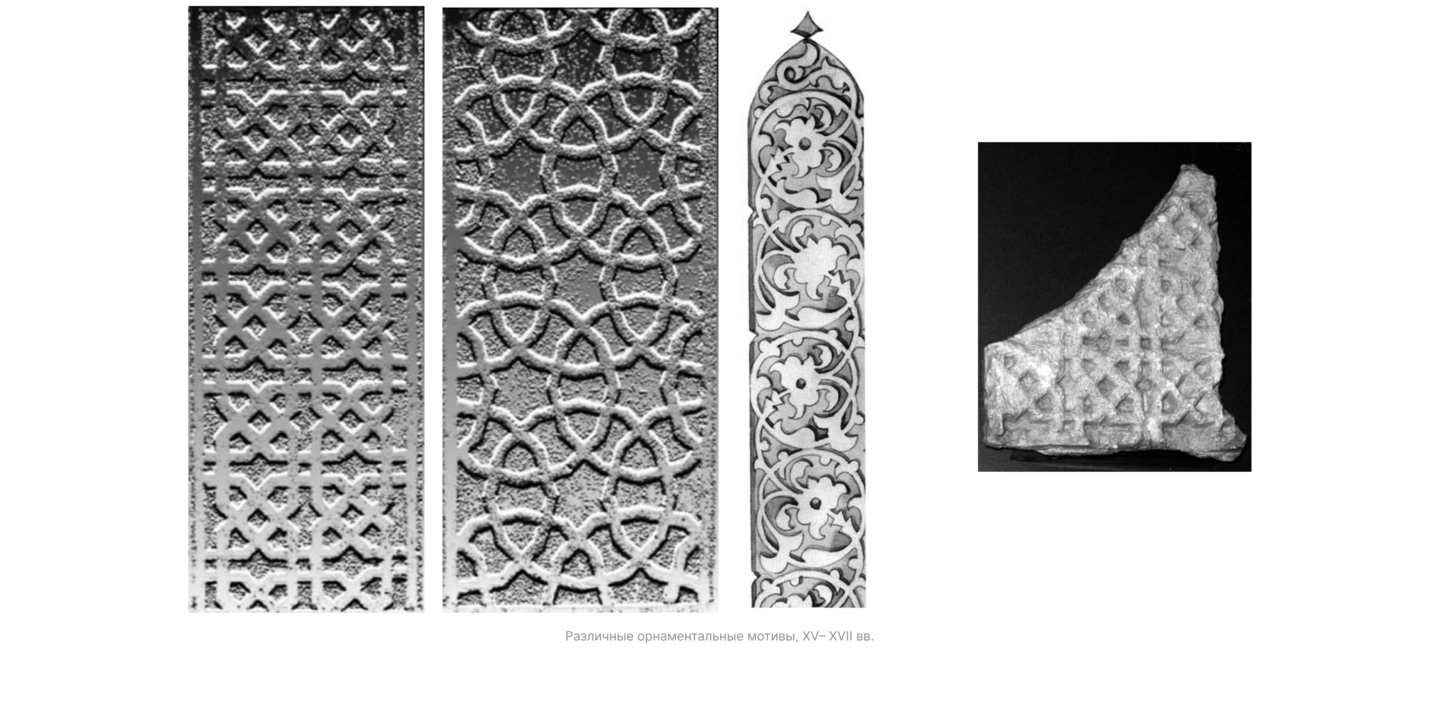 В архитектуре и постройках — мечетях и мавзолеях — заметен перенос растительной декоративной пластики на камень: резные колонны, капители, порталы с стилизованным растительным орнаментом, арочными и растительными фризами.