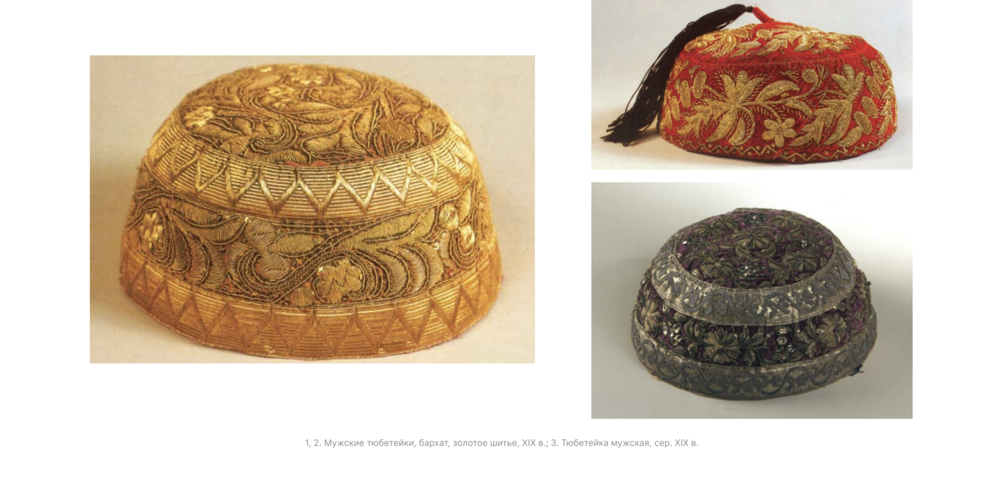 Головные уборы Традиционные татарские головные уборы — один из самых устойчивых символов татарской одежды. Мужчины носили тюбетейки — небольшую вышитую или бархатную шапочку, часто украшенную орнаментом и бисером. Это был повседневный «нижний» головной убор, обязательный по мусульманской традиции.