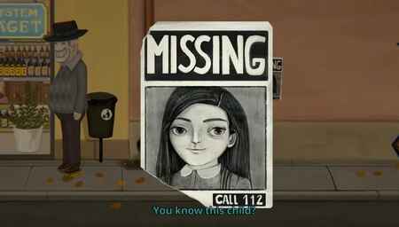 Стены домов увешанные объявлениями о пропавших детях, Скриншот из игры Little Misfortune, 2019 г.