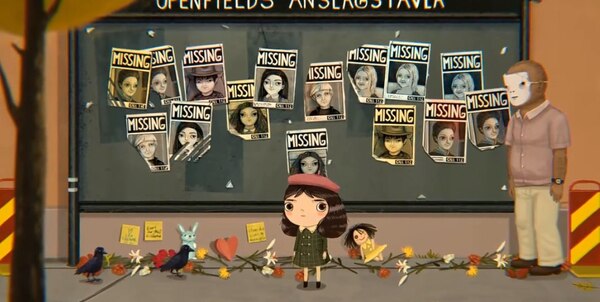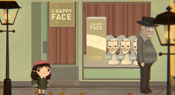 Визуальная наивность скрывает мрачное содержание. Город, по которому идет девочка, выглядит оживленным только на расстоянии. При детальном осмотре становится заметно что люди носят жуткие маски с нарисованными улыбками, реклама убеждает прятать свое лицо, стены увешаны объявлениями о пропавших детях, на улицах нет настоящей жизни. Цвета на переднем плане мягкие и спокойные, но фоновые детали демонстрируют распад и безразличие.