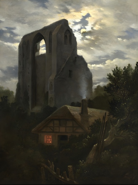 Джон Селл Котман «Руины аббатства Риво, Йоркшир», 1803 Карл Густав Карус «Руины аббатства Эльдена и деревенский дом рядом с Грайфсвальдом в лунном свете», 1819–1820