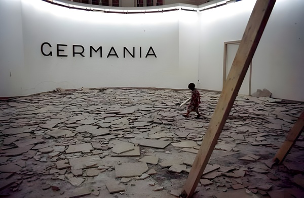 У Хааке сама руинизация становится художественным методом, а не только темой. В своей инсталляции он не изображает развалины, а превращает в них архитектуру немецкого павильона. Важно, что он работает минимальным, но радикальным жестом: не строит новую форму, а разрушает основание, заложенное при Гитлере, заставляя тело зрителя прочувствовать эту трещину.
